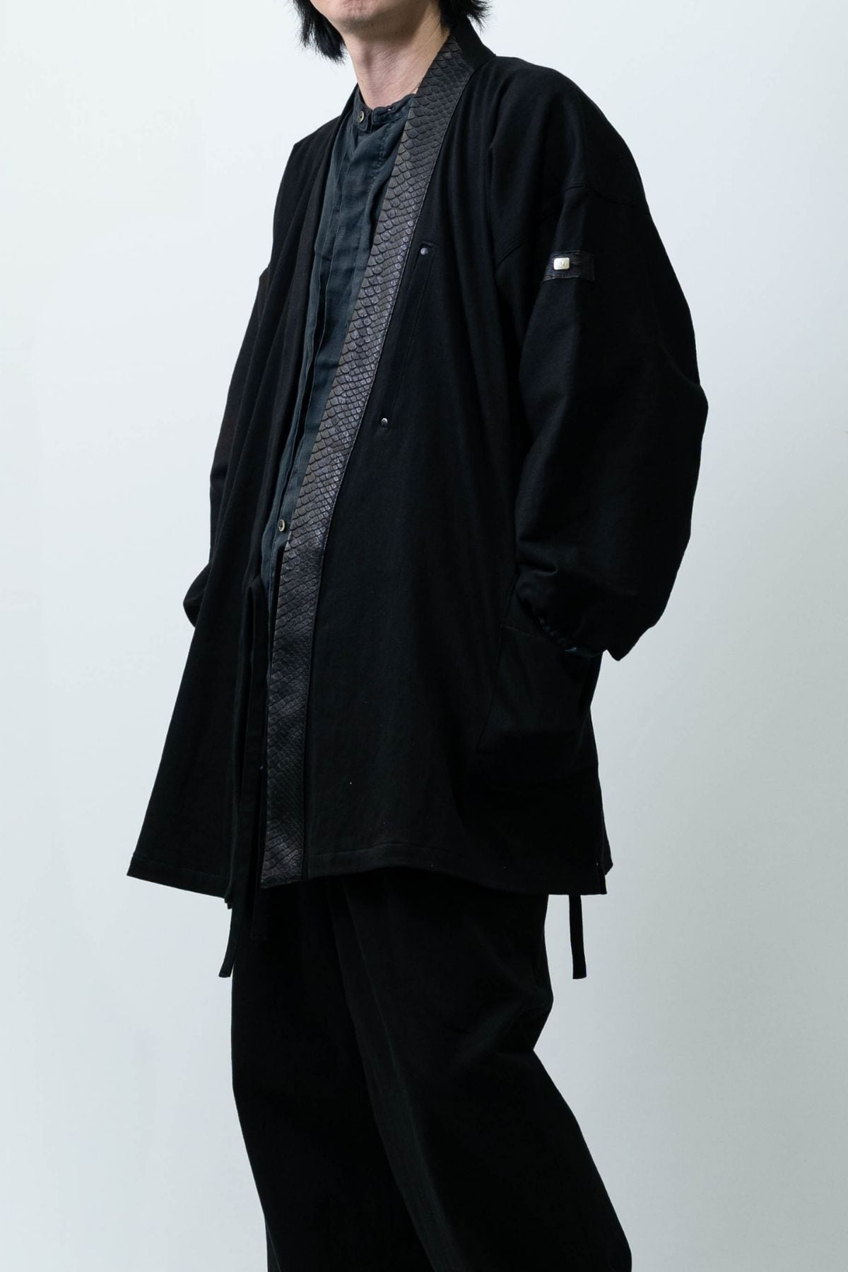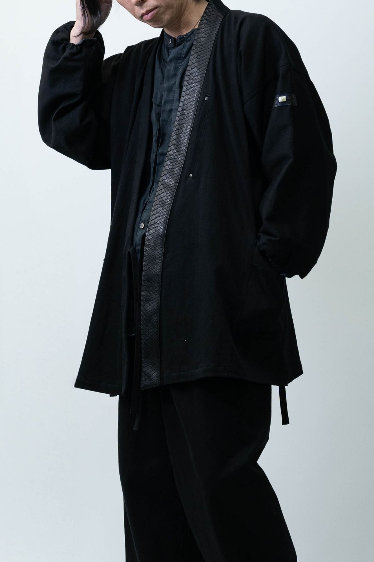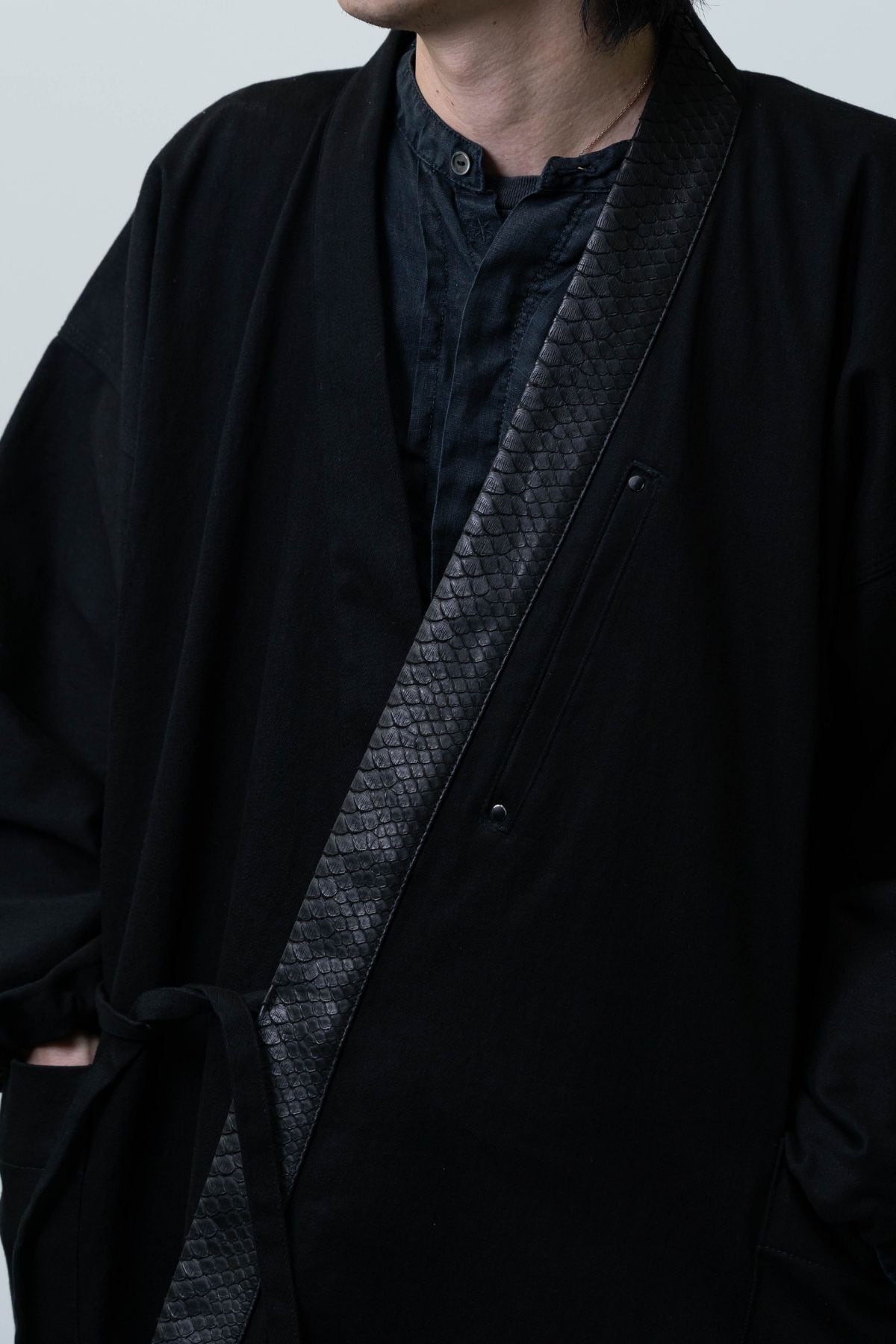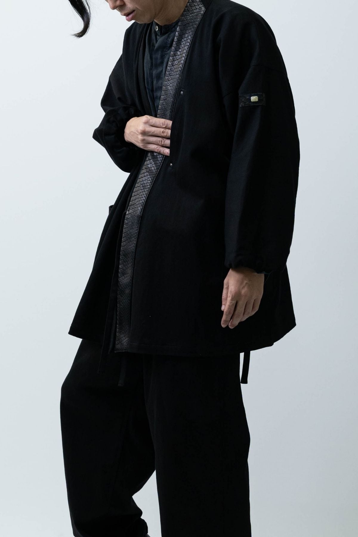特別なこの一着は、力強い龍の象徴「蛇革」と、艶やかな岡山産ブラックデニムを組み合わせ、ただの作務衣を超えた、現代の"鎧"として完成されました。