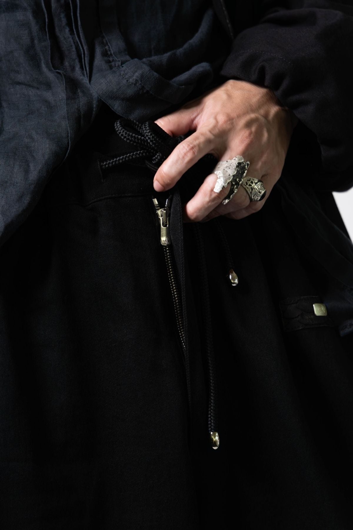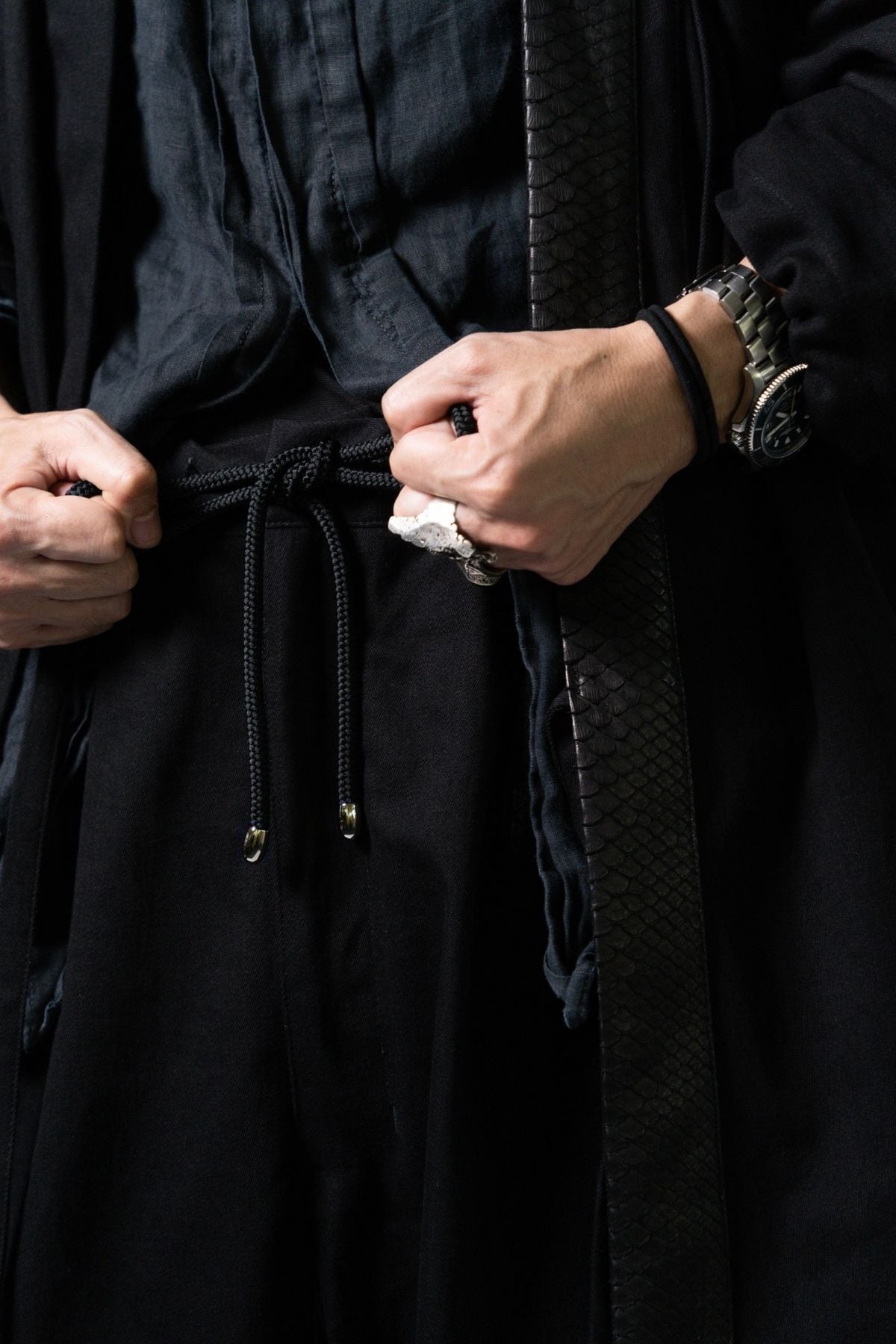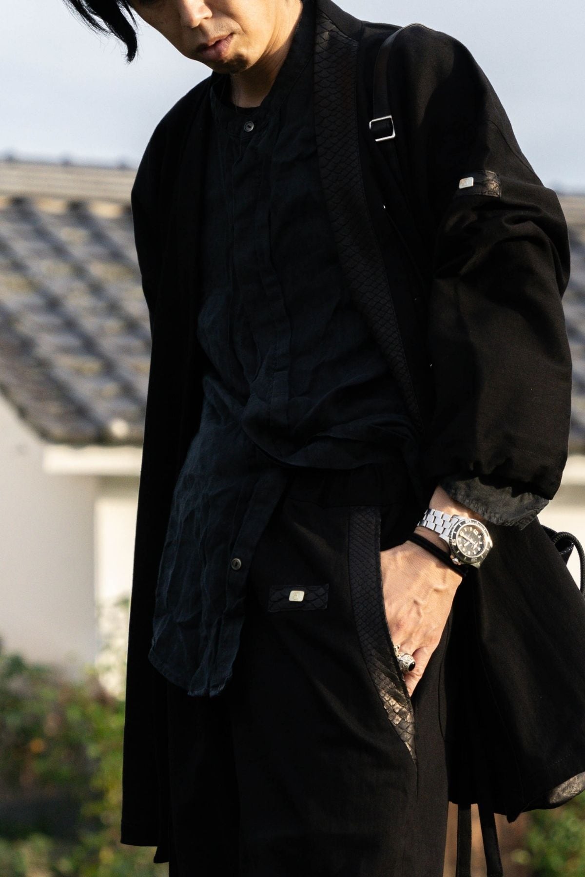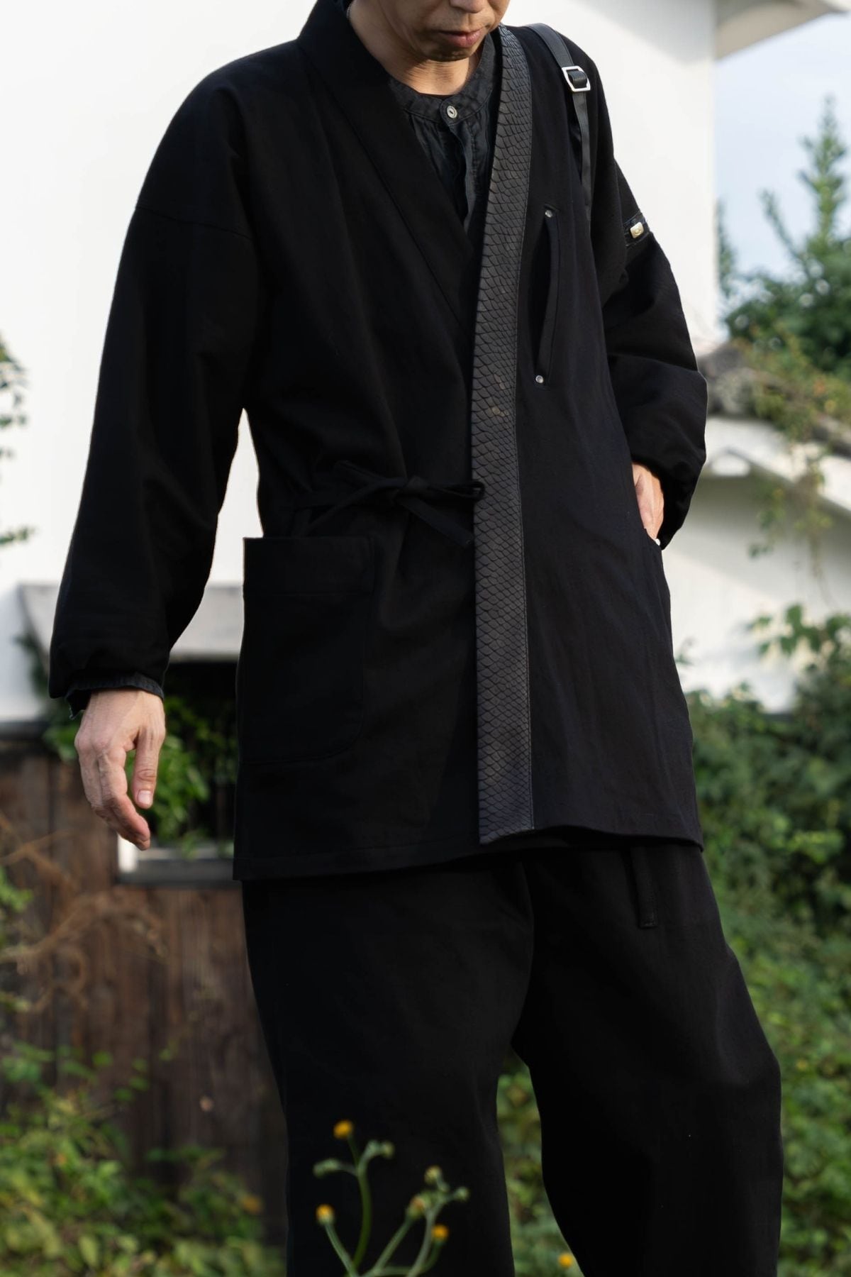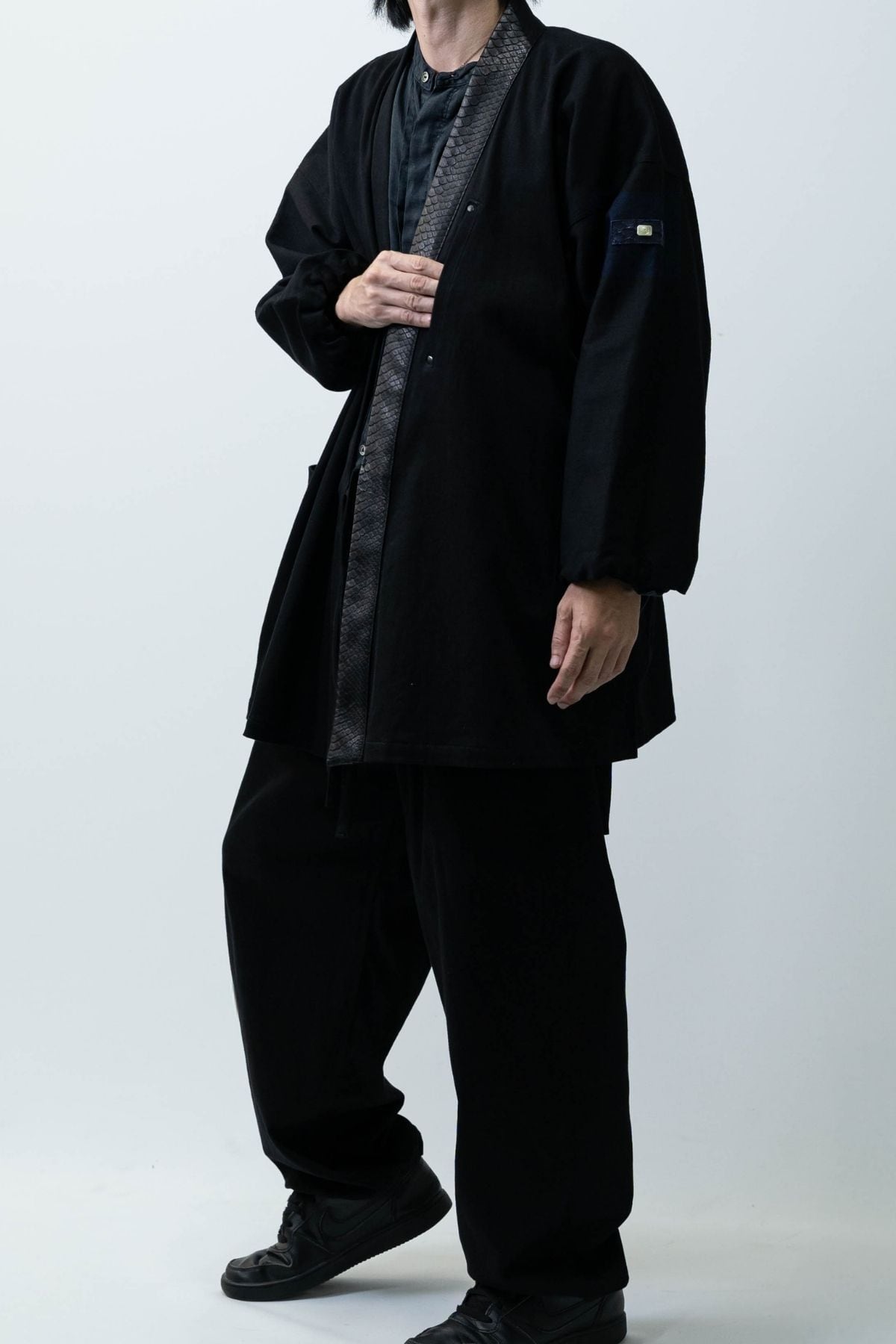 特別なこの一着は、力強い龍の象徴「蛇革」と、艶やかな岡山産ブラックデニムを組み合わせ、ただの作務衣を超えた、現代の"鎧"として完成されました。
