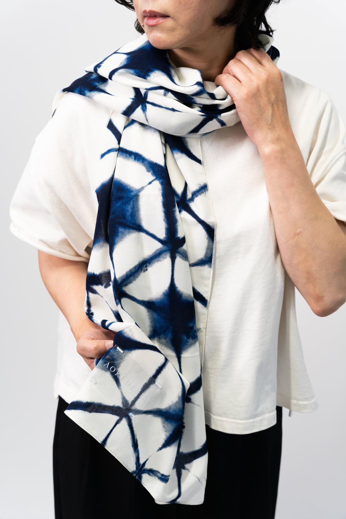 古来の絞り染めから着想を得た、静けさと力強さを併せ持つストールが完成しました。