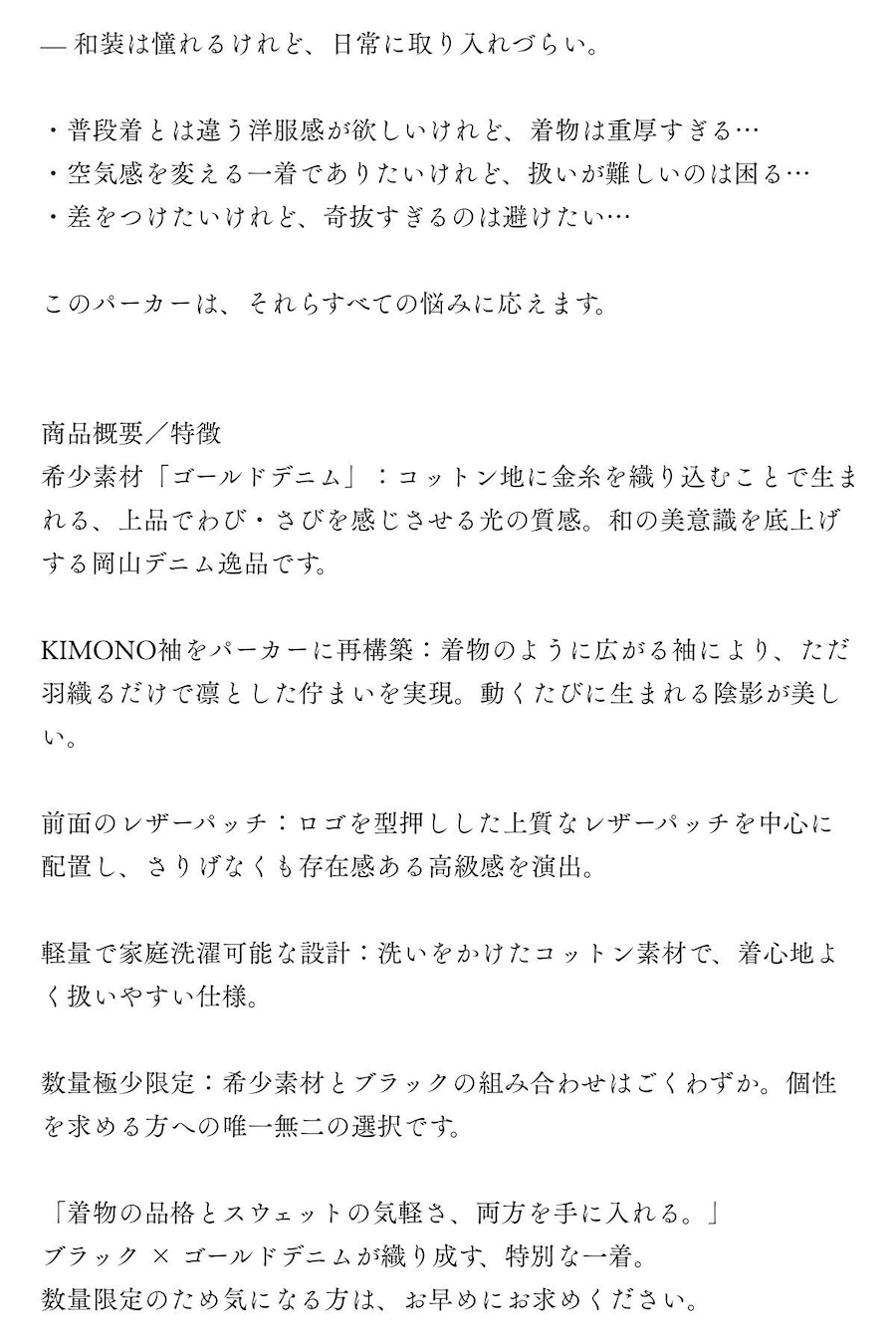 【新作のお知らせ】【青木被服×KIMONOT®】コラボレーションKIMONOパーカー “BLACK × ゴールドデニム”【極少数限定】