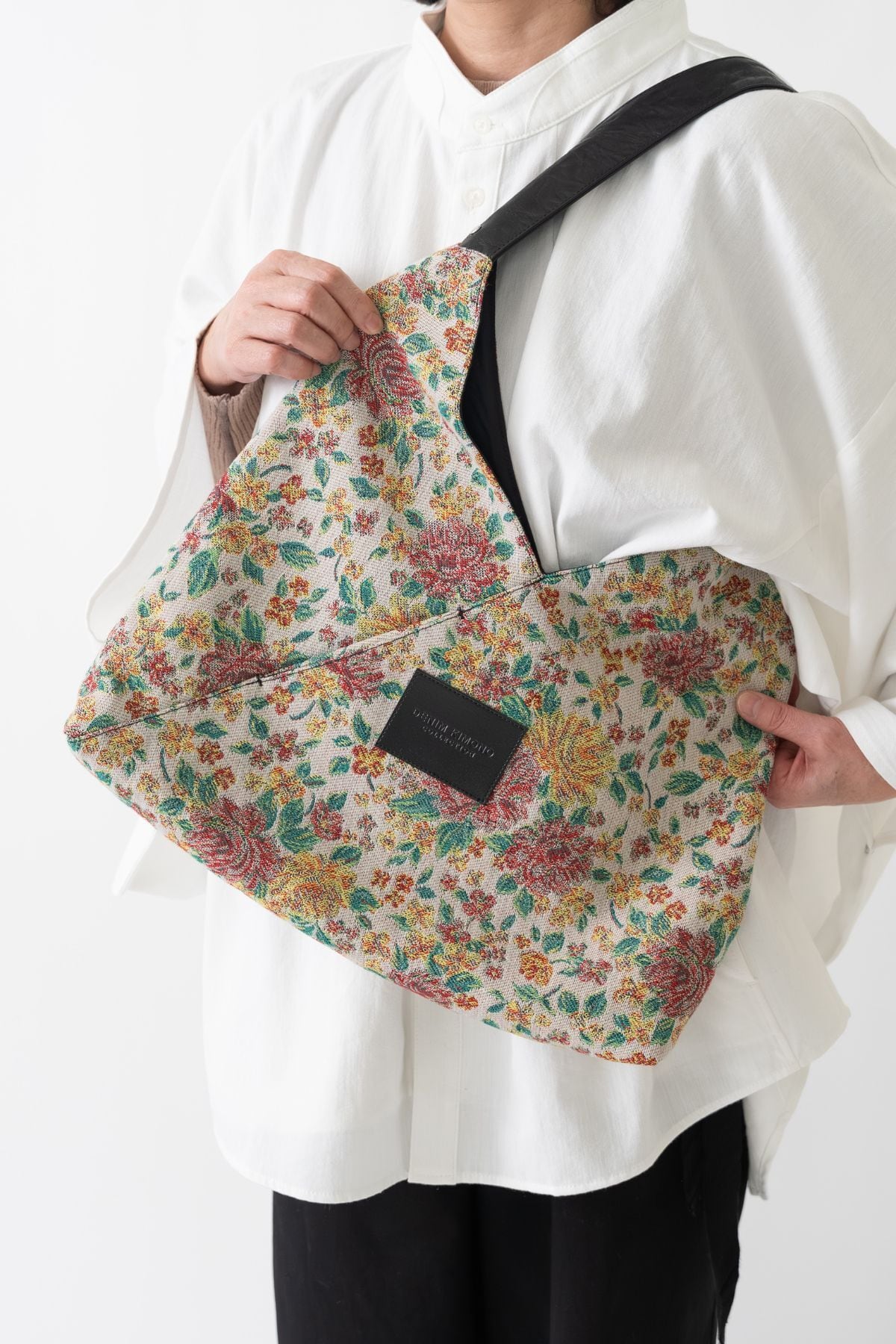 岡山の機屋で織り上げたフラワージャガードデニムを使用した、新作の「あずまバッグ」。和の“包み布”を再構築したミニマルなフォルムに、立体的な花柄が華やぎを添える一品です。
