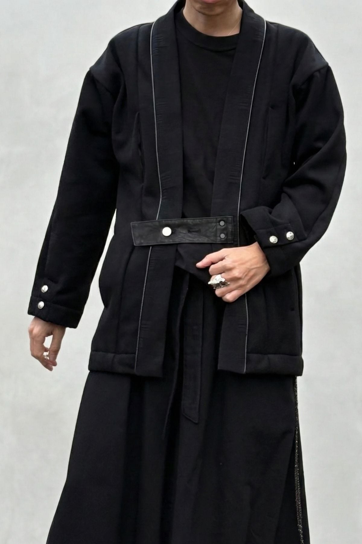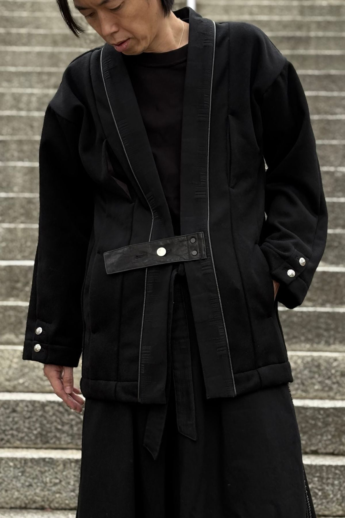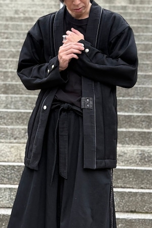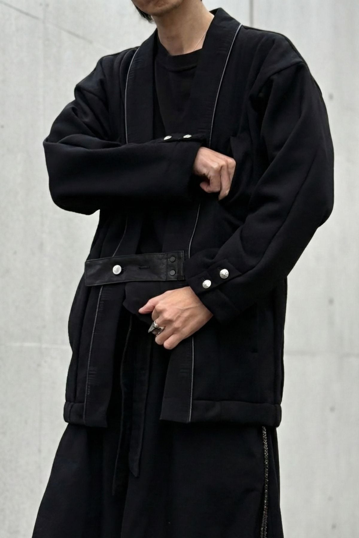 伝統的な羽織をベースに、ショート丈で再構築した現代的なシルエット。