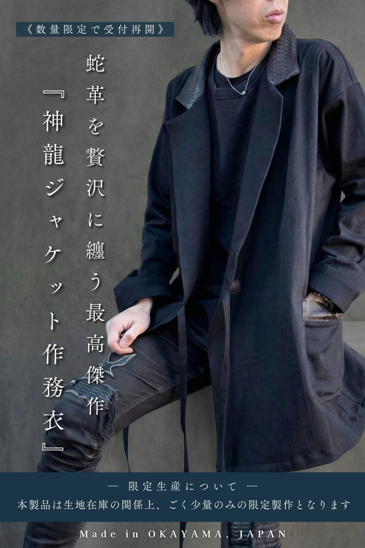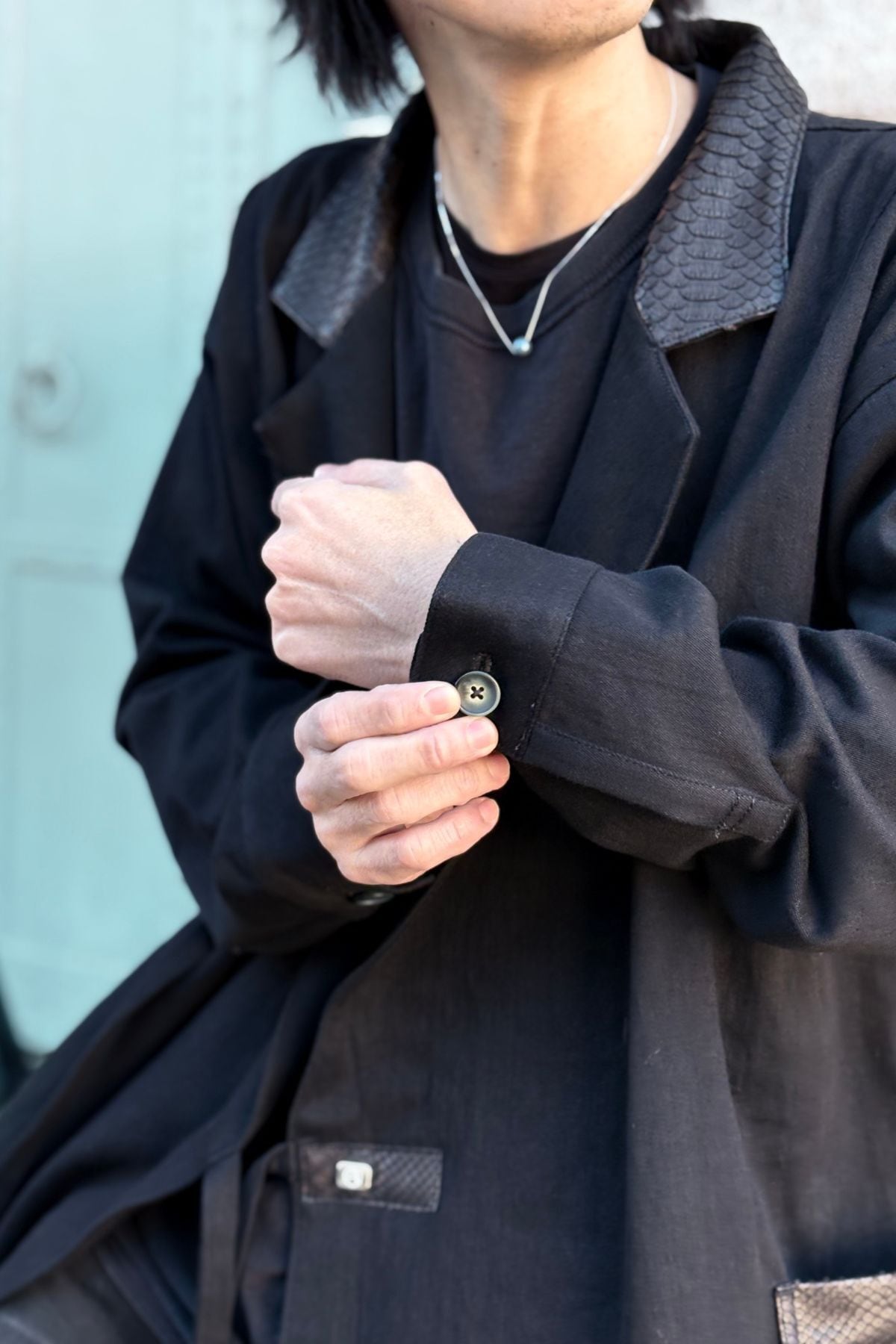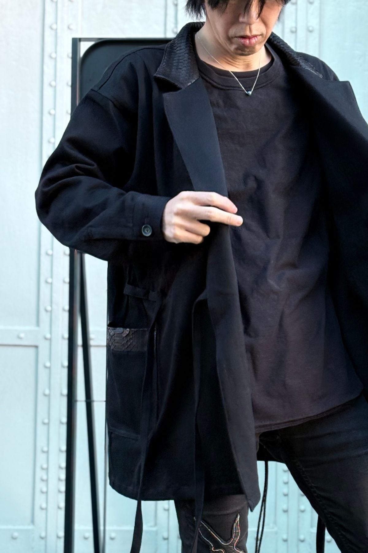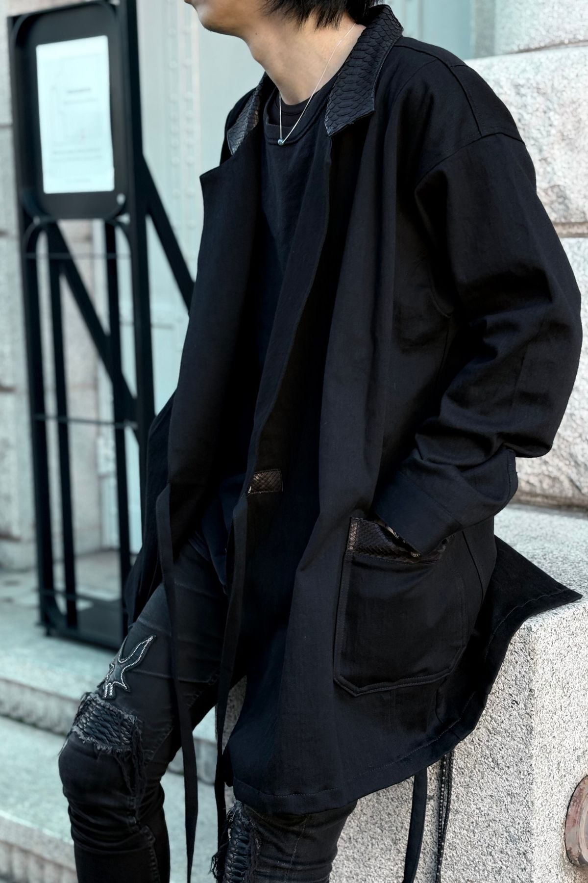 【数量極少|完全受注生産】極上の"縁"を纏う、黒蛇作務衣ジャケット-縁- / SAMUE JACKET YOSUGA― 黒に宿る、和の品格と革の存在感 【岡山ブラックデニム × パイソンレザー】【made in JAPAN】