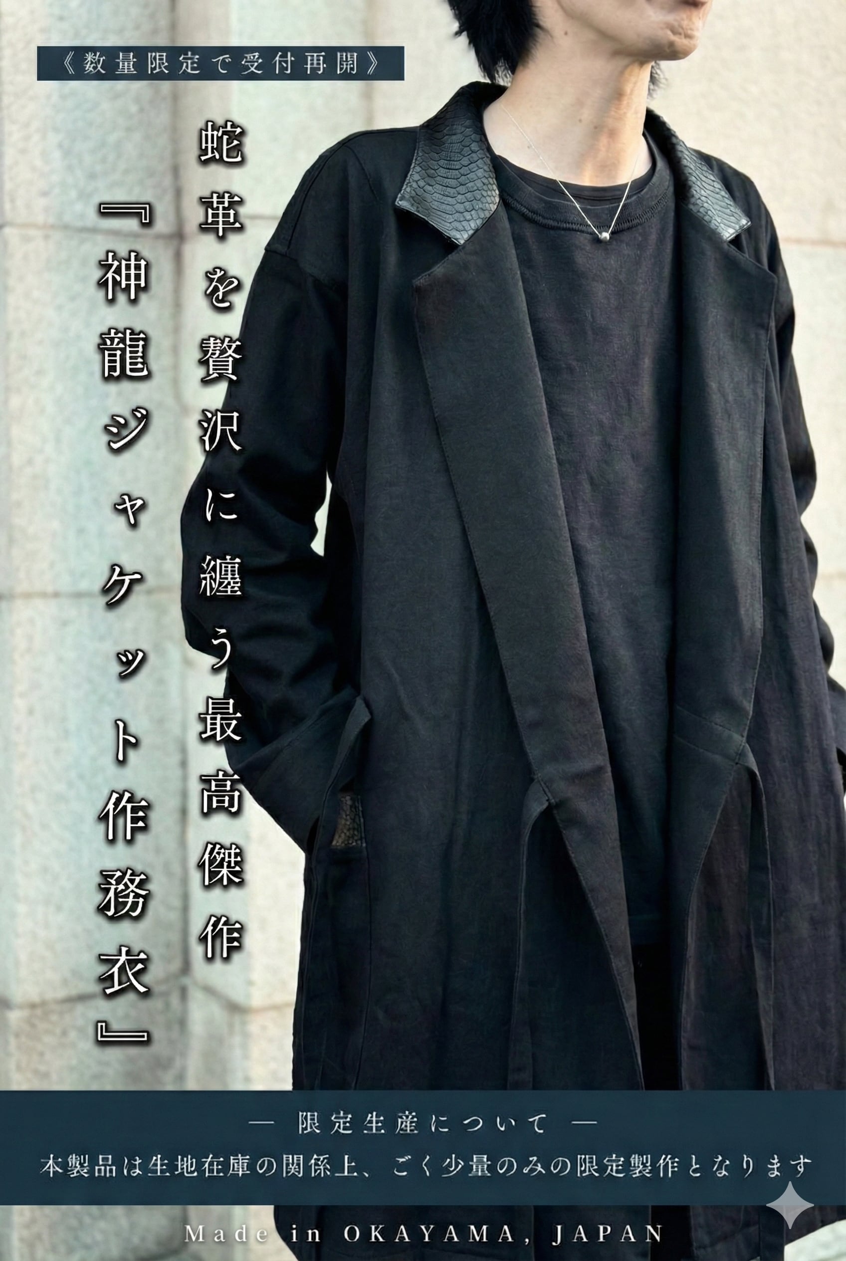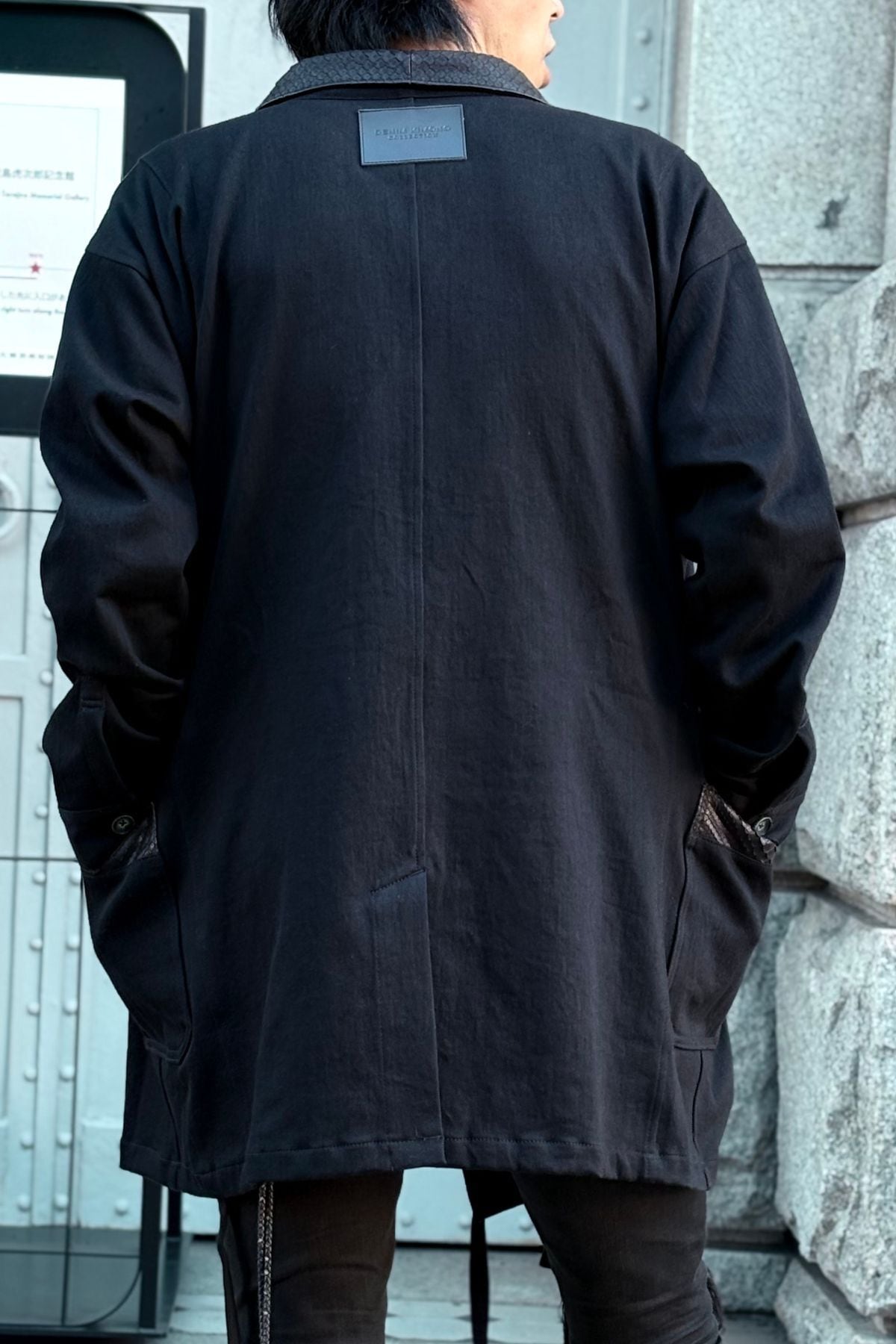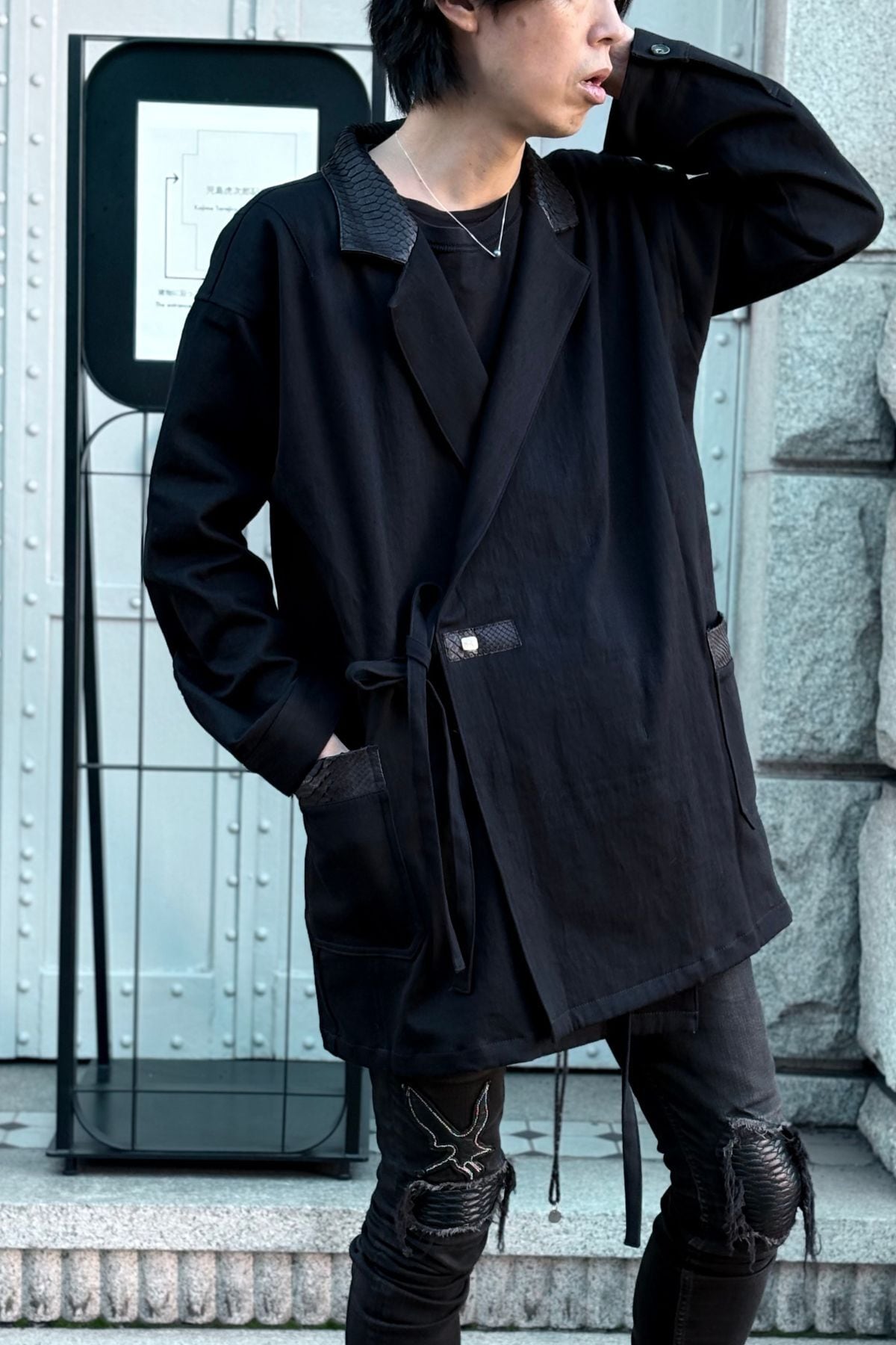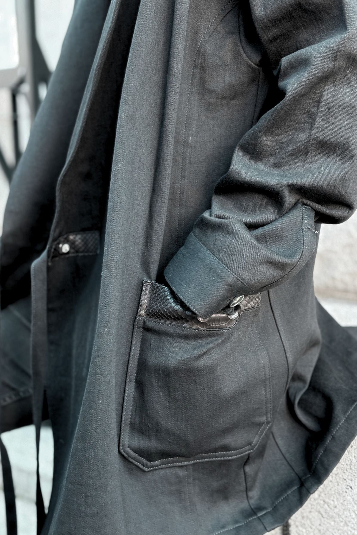 【数量極少|完全受注生産】極上の"縁"を纏う、黒蛇作務衣ジャケット-縁- / SAMUE JACKET YOSUGA― 黒に宿る、和の品格と革の存在感 【岡山ブラックデニム × パイソンレザー】【made in JAPAN】