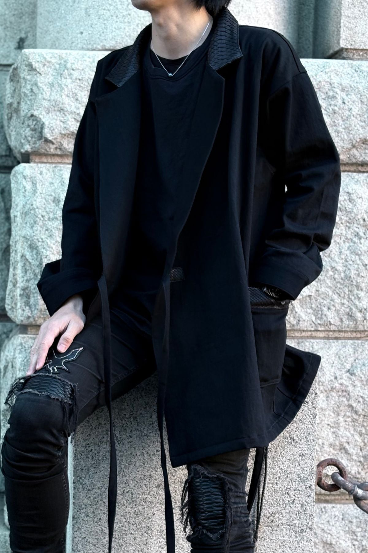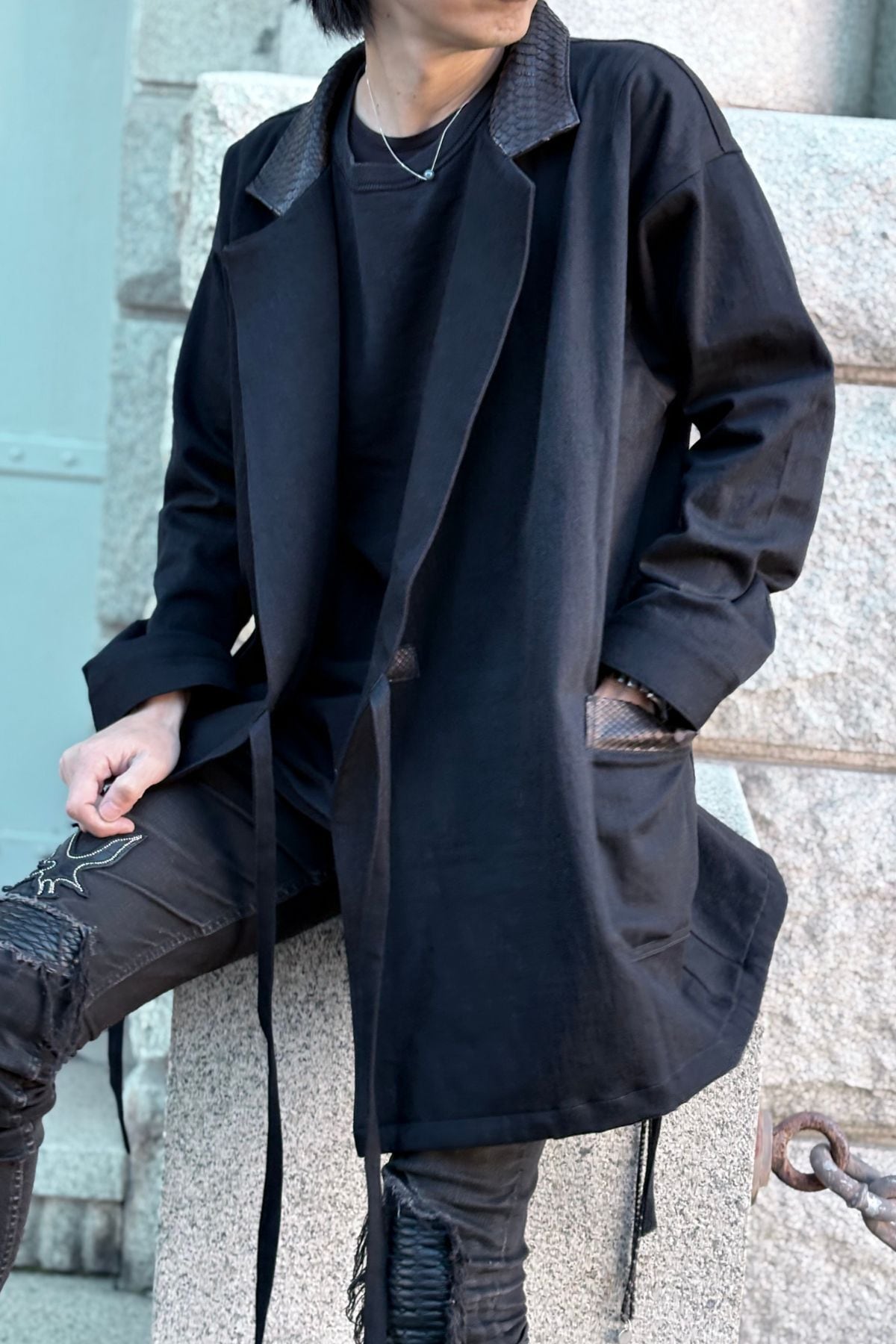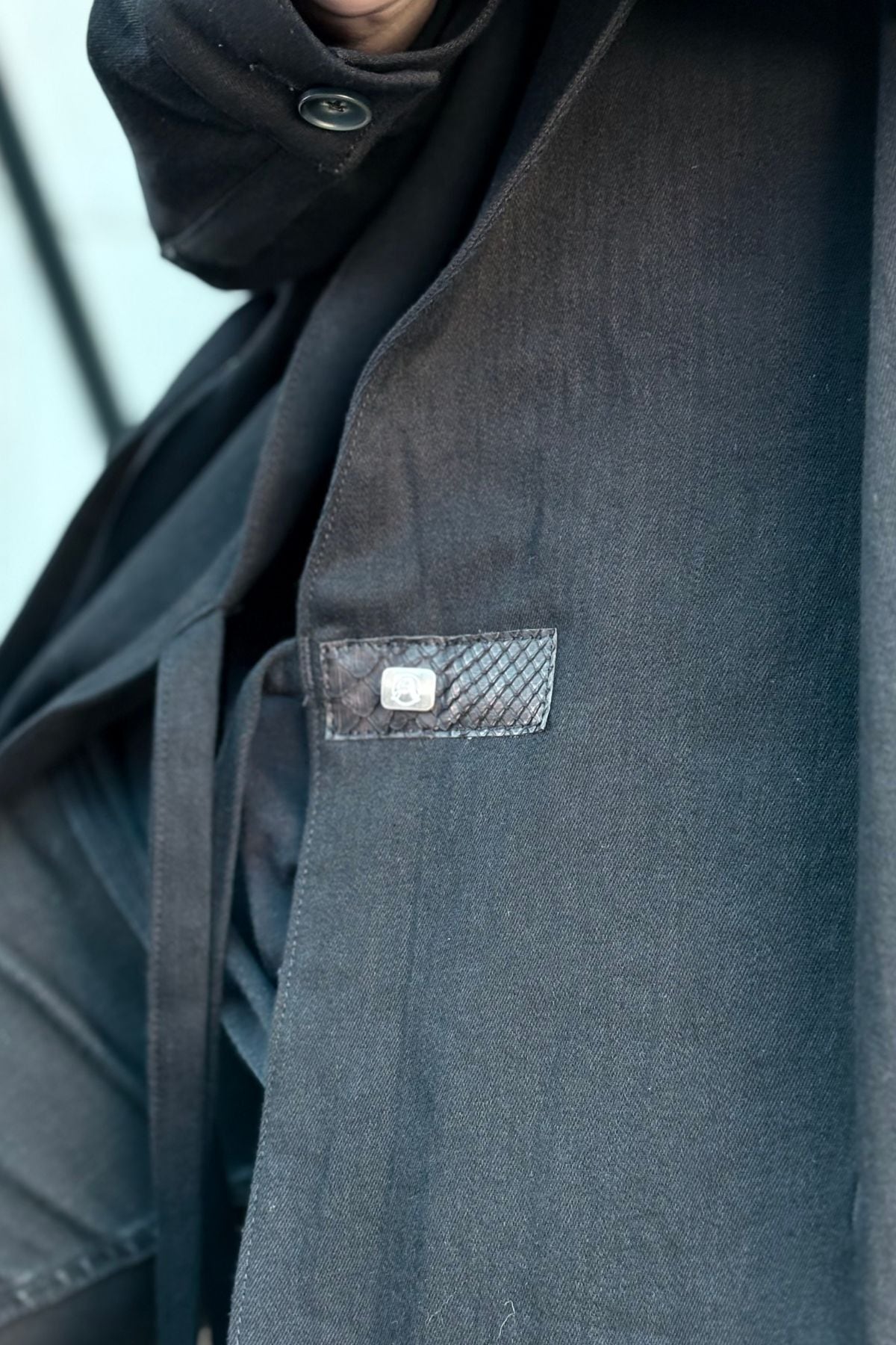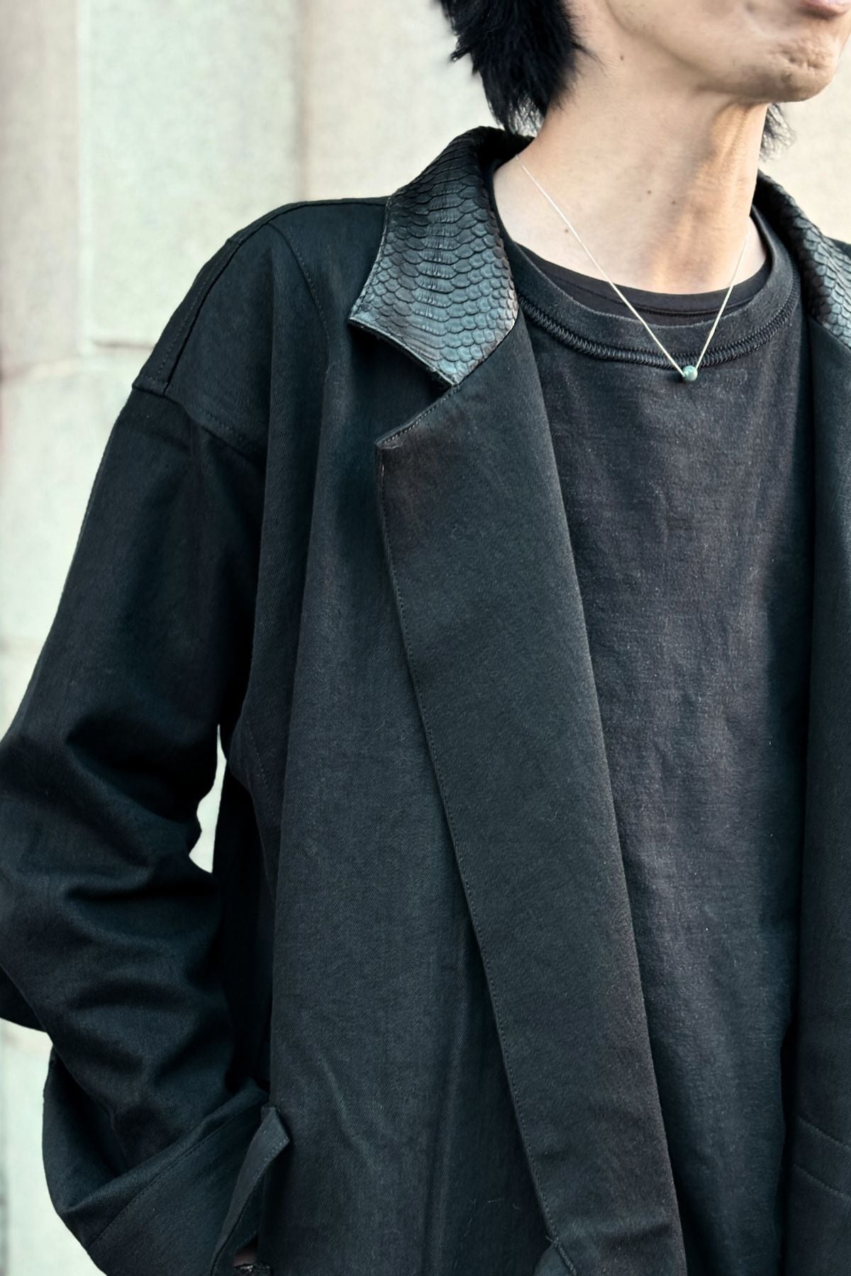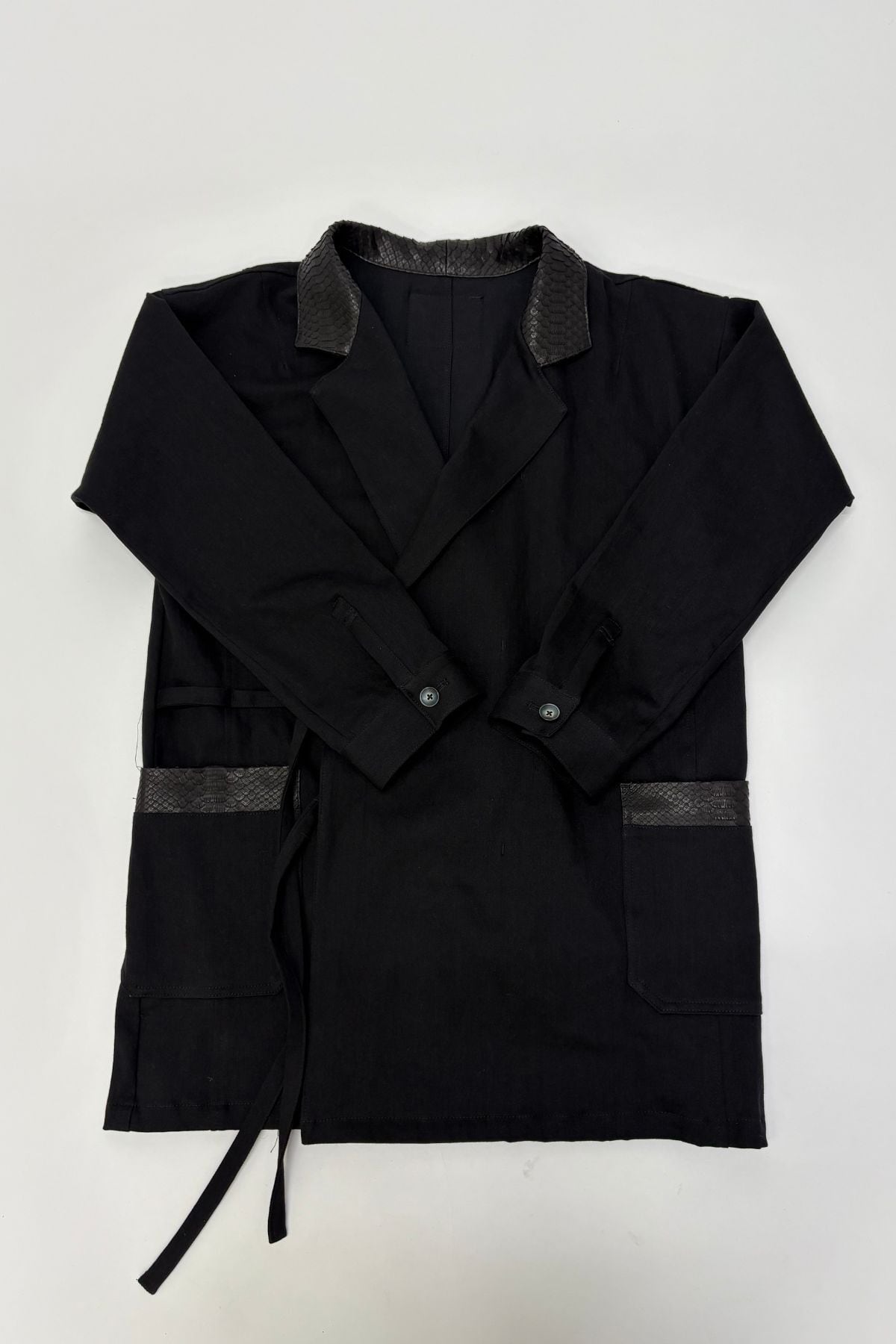 【数量極少|完全受注生産】極上の"縁"を纏う、黒蛇作務衣ジャケット-縁- / SAMUE JACKET YOSUGA― 黒に宿る、和の品格と革の存在感 【岡山ブラックデニム × パイソンレザー】【made in JAPAN】