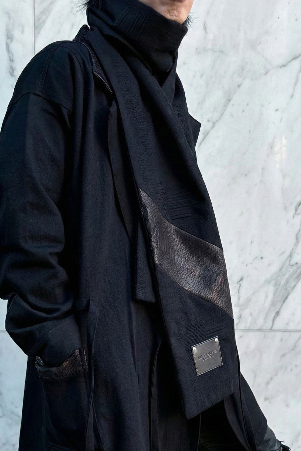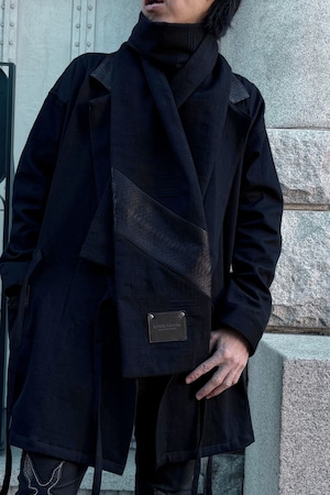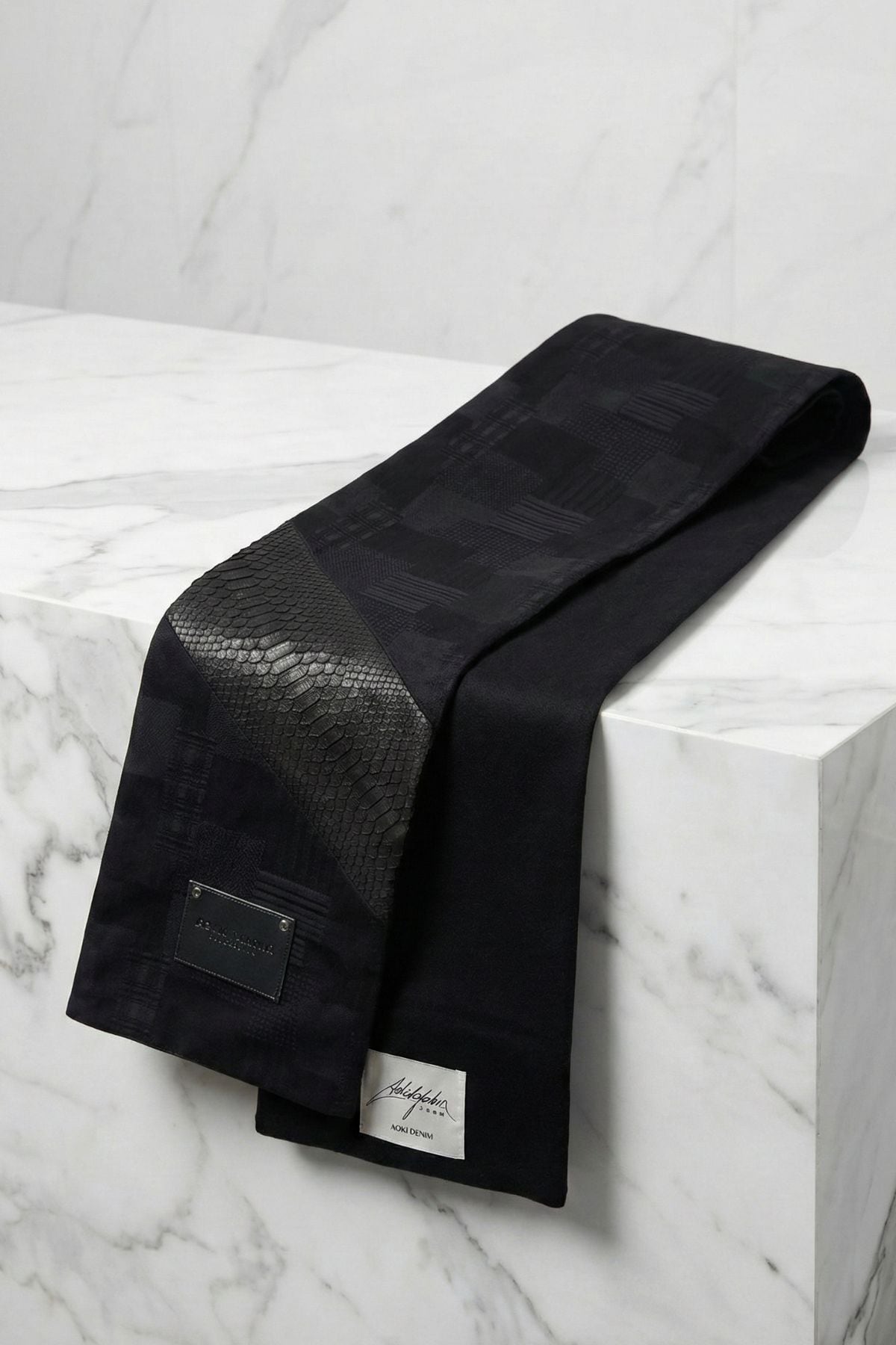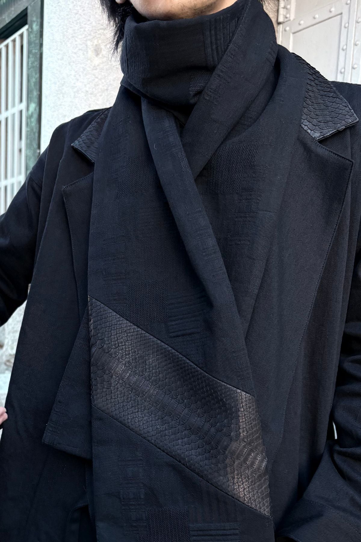 このマフラーは、岡山産刺子ジャガードデニム、カシミアウール、パイソンレザー。