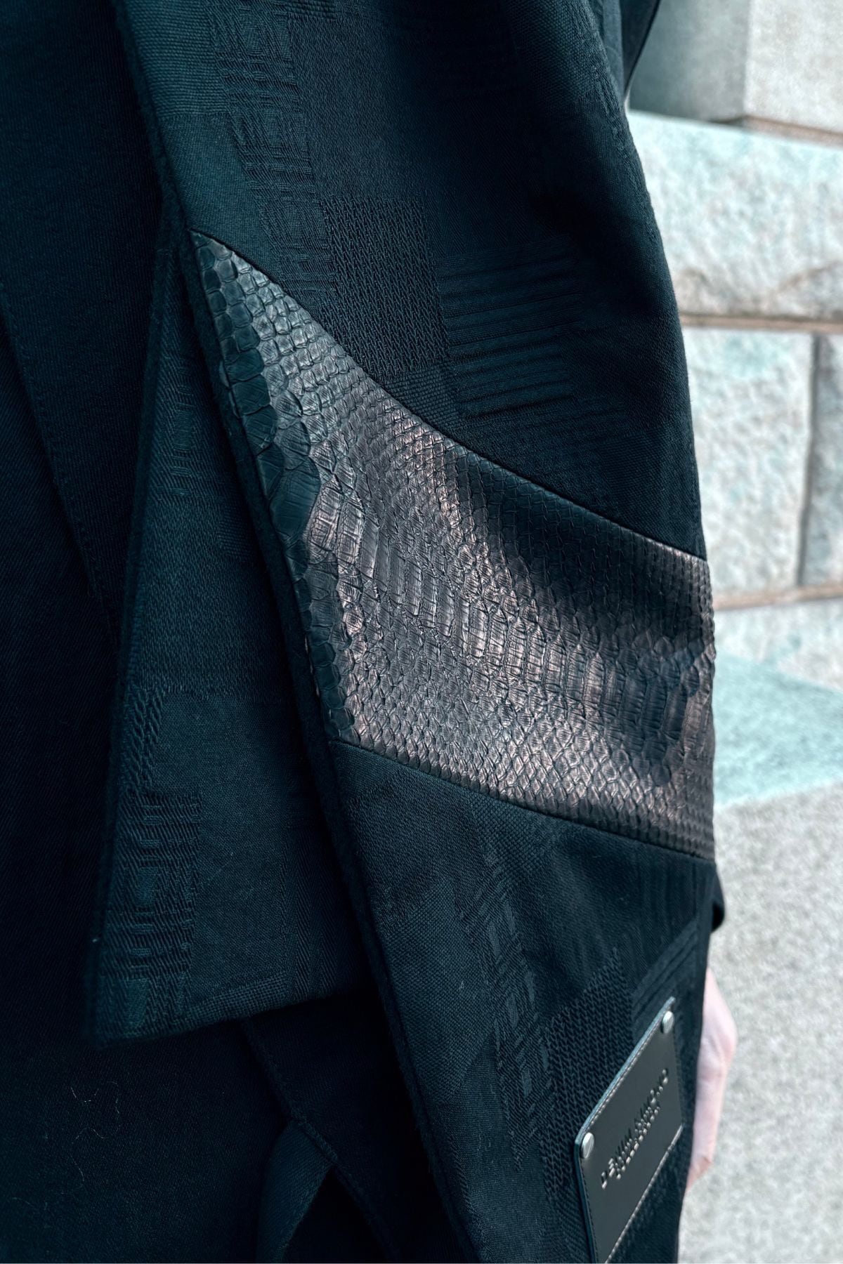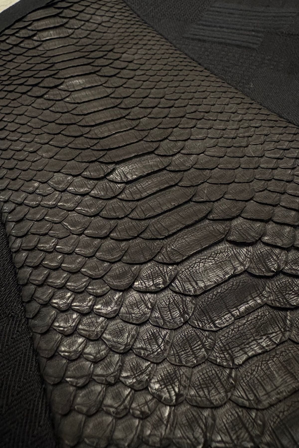 巨大黒蛇・ブラックパイソンレザーが、静かでありながら力強い存在感を放つ一枚に仕上がりました。