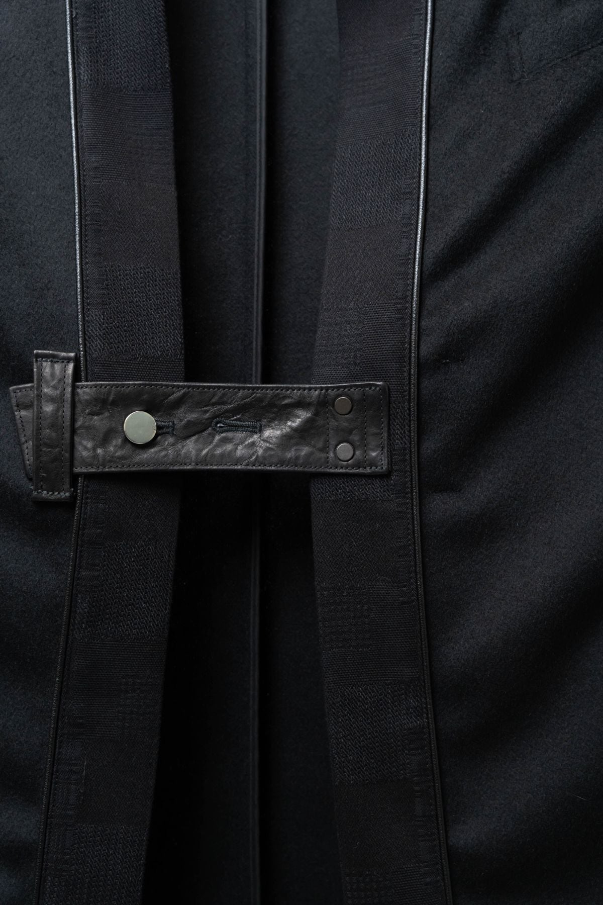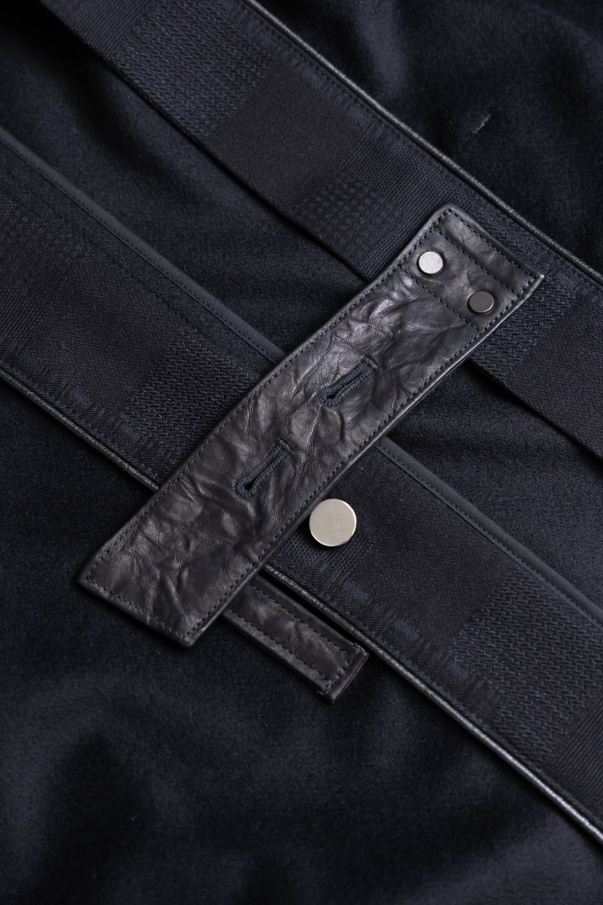 衿部分には岡山県産の「刺子柄ブラックジャガードデニム」を贅沢に使用しており、大人の渋みを演出します。またベルト部分にはアリゾナレザーを施しており、重厚感を演出します。