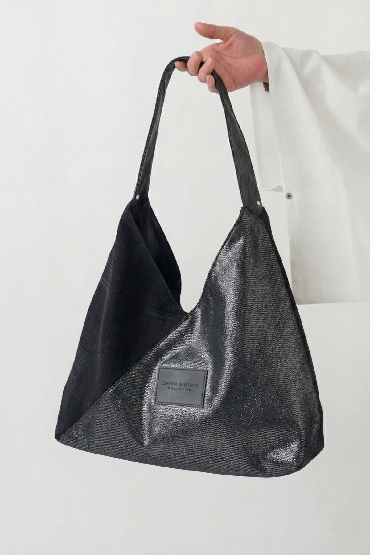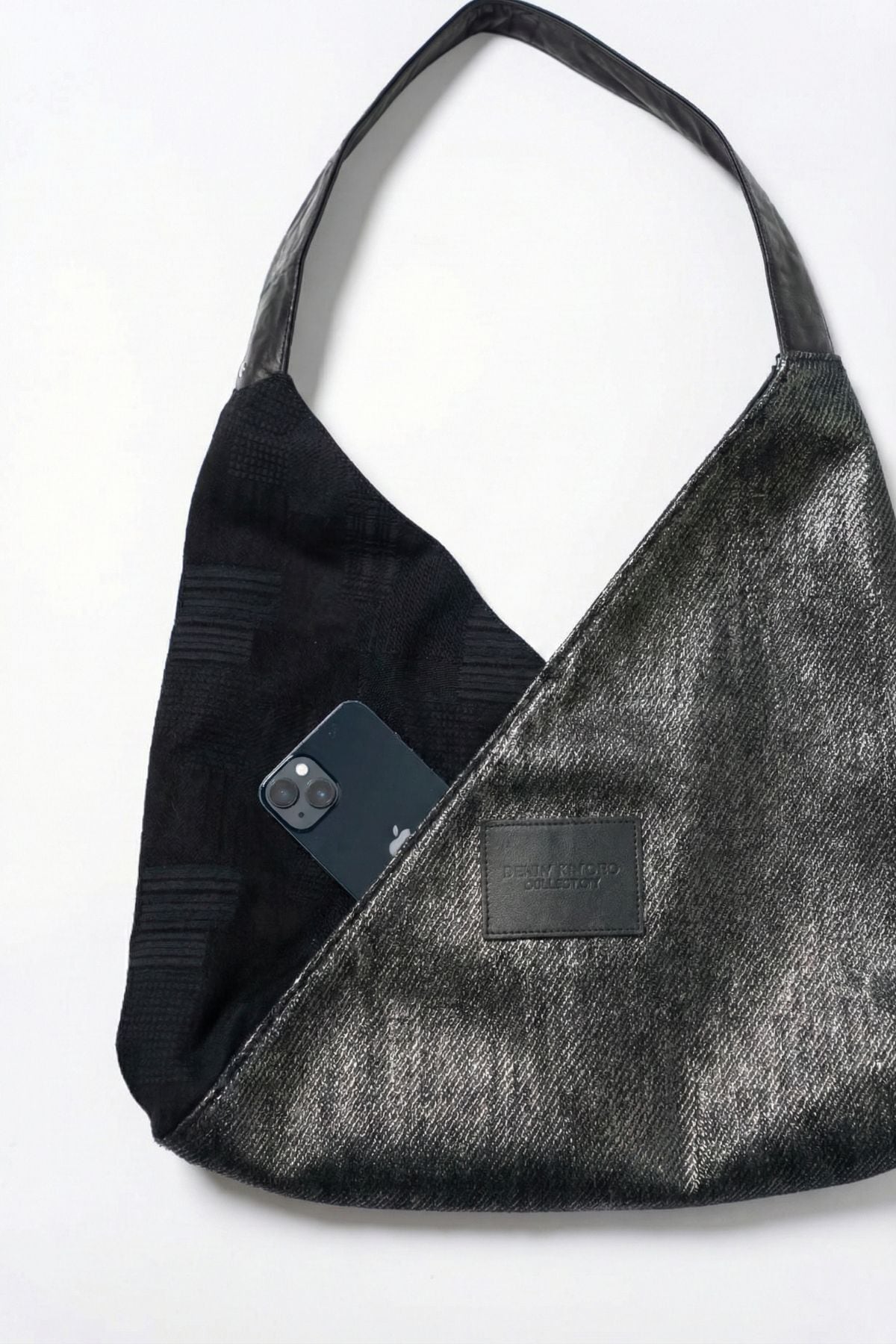 二種のデニムを組み合わせた、立体構築のあずま袋型バッグ。