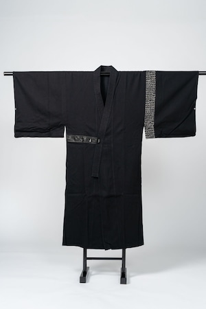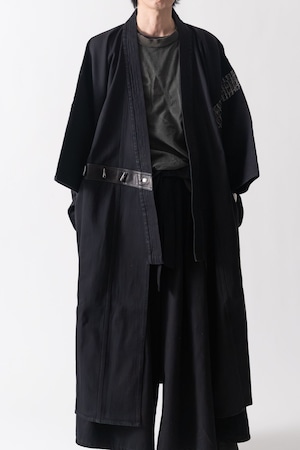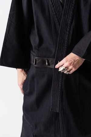 本作は、羽織の構造をベースにしながら、フロントにトグルとアリゾナレザーの留め具を配し、ウエストサイズの調整を可能にした新しい解釈の羽織です。