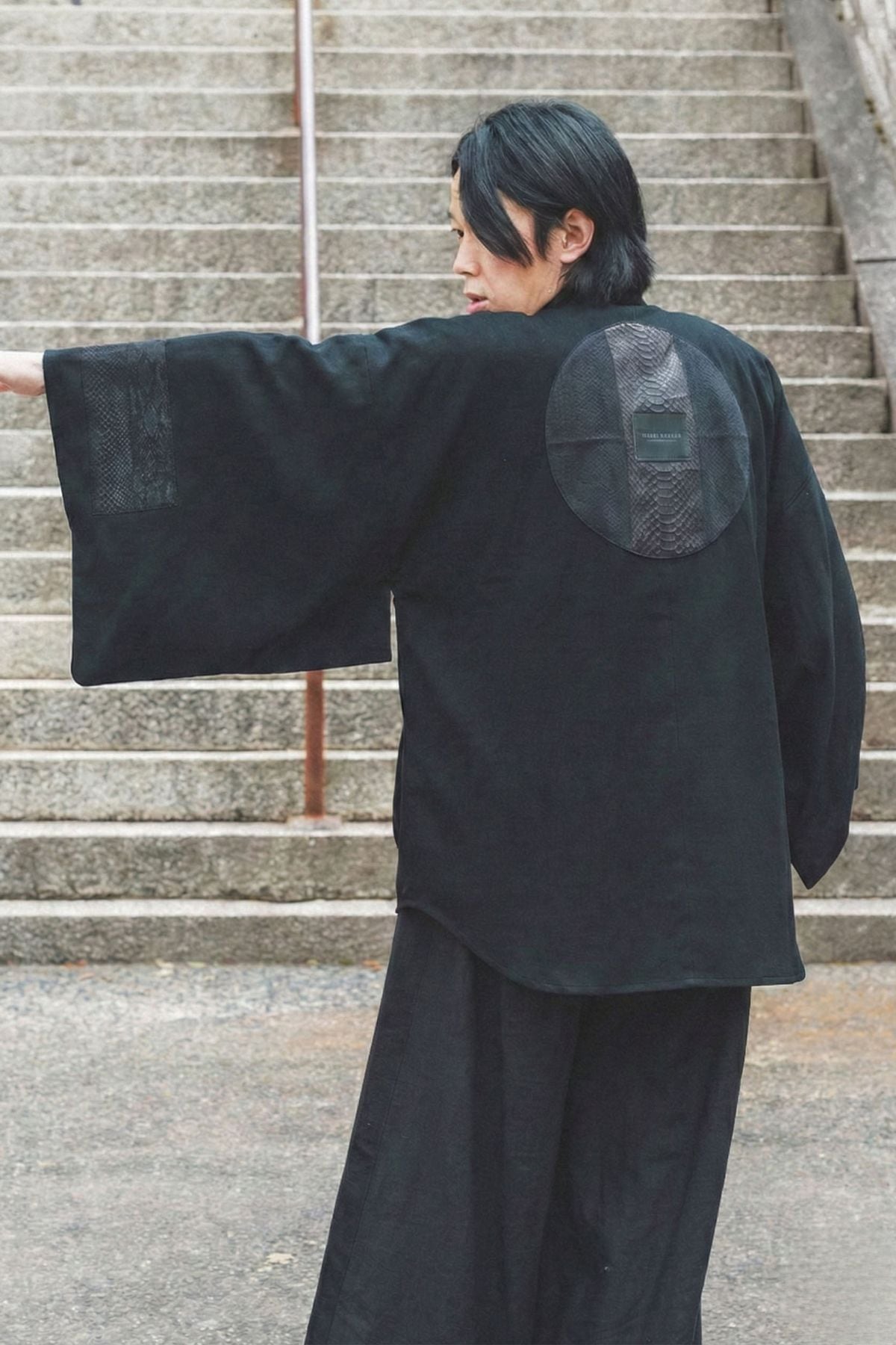 このモデルは通常のKIMONOシャツをベースにしながら、背面の円形パネルにリアルパイソンを配し、“守り”や“象徴”を感じさせるデザインへと昇華させました。