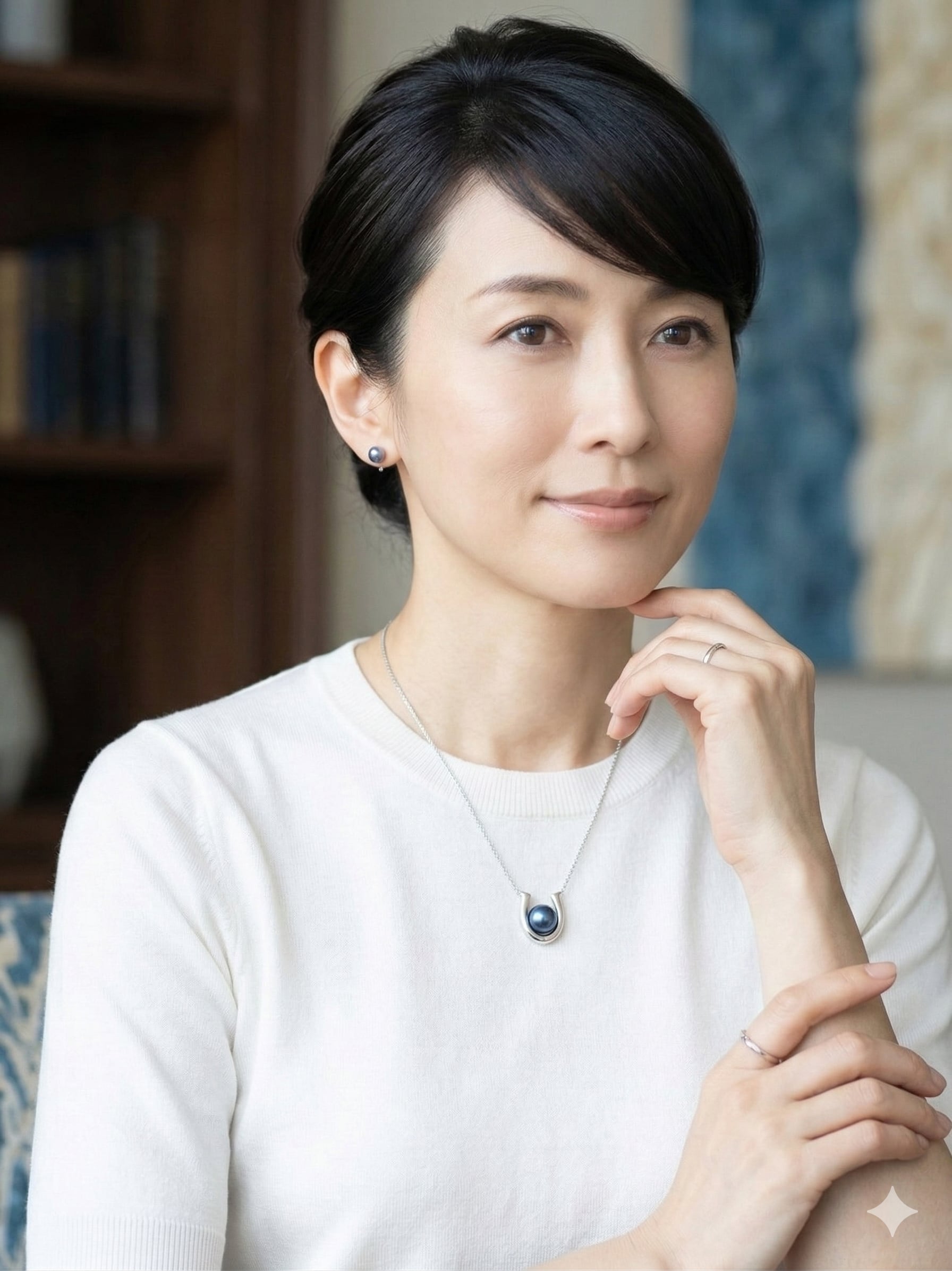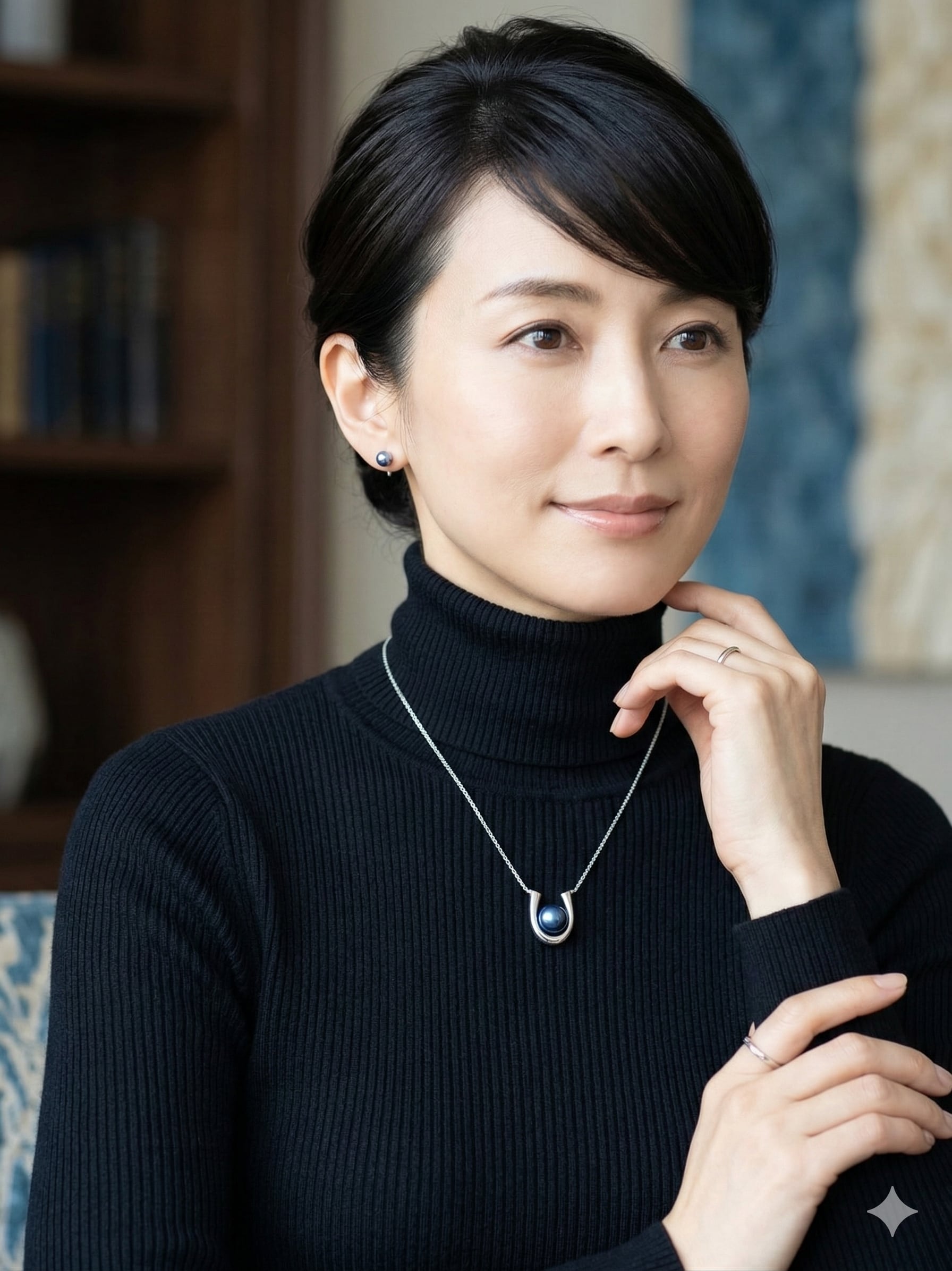 藍色の真珠が、胸元に静かなアクセントを生み出します。