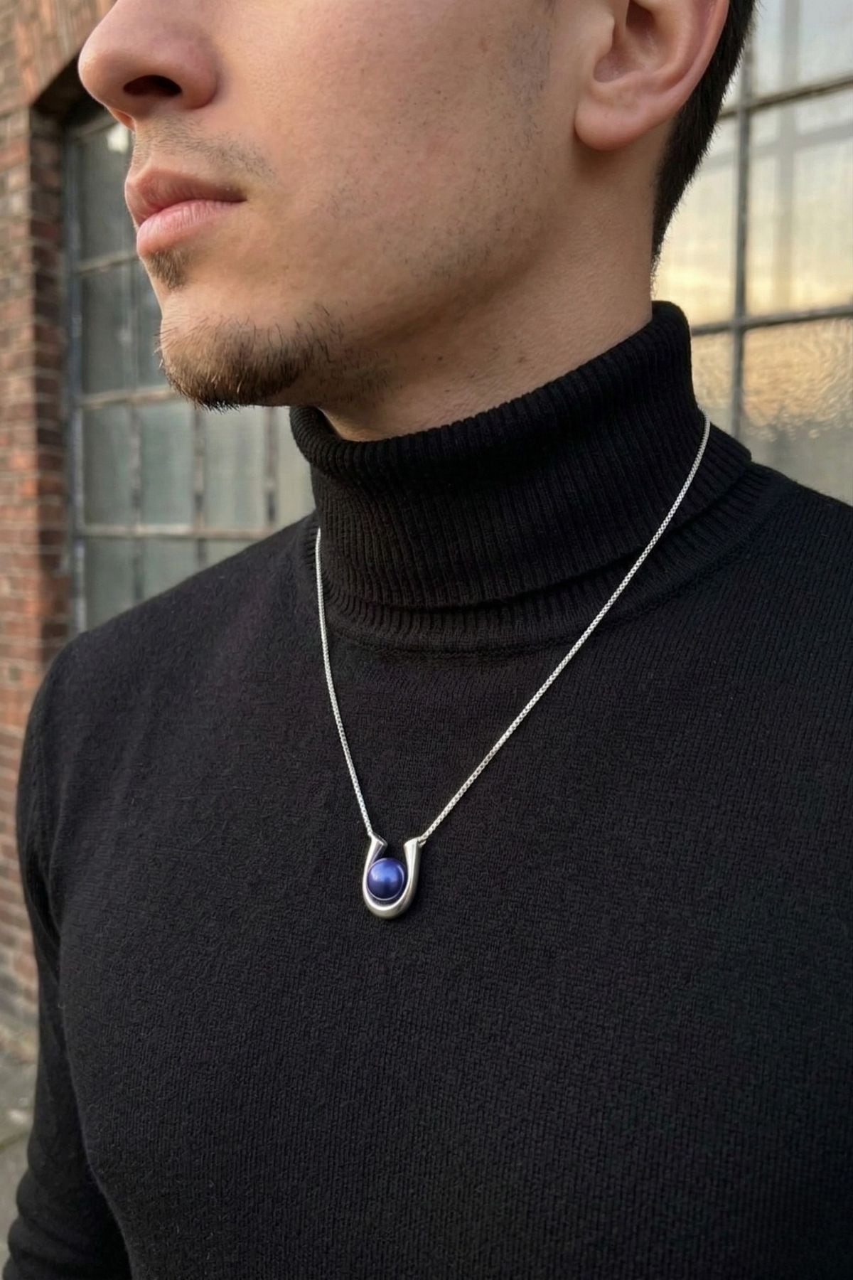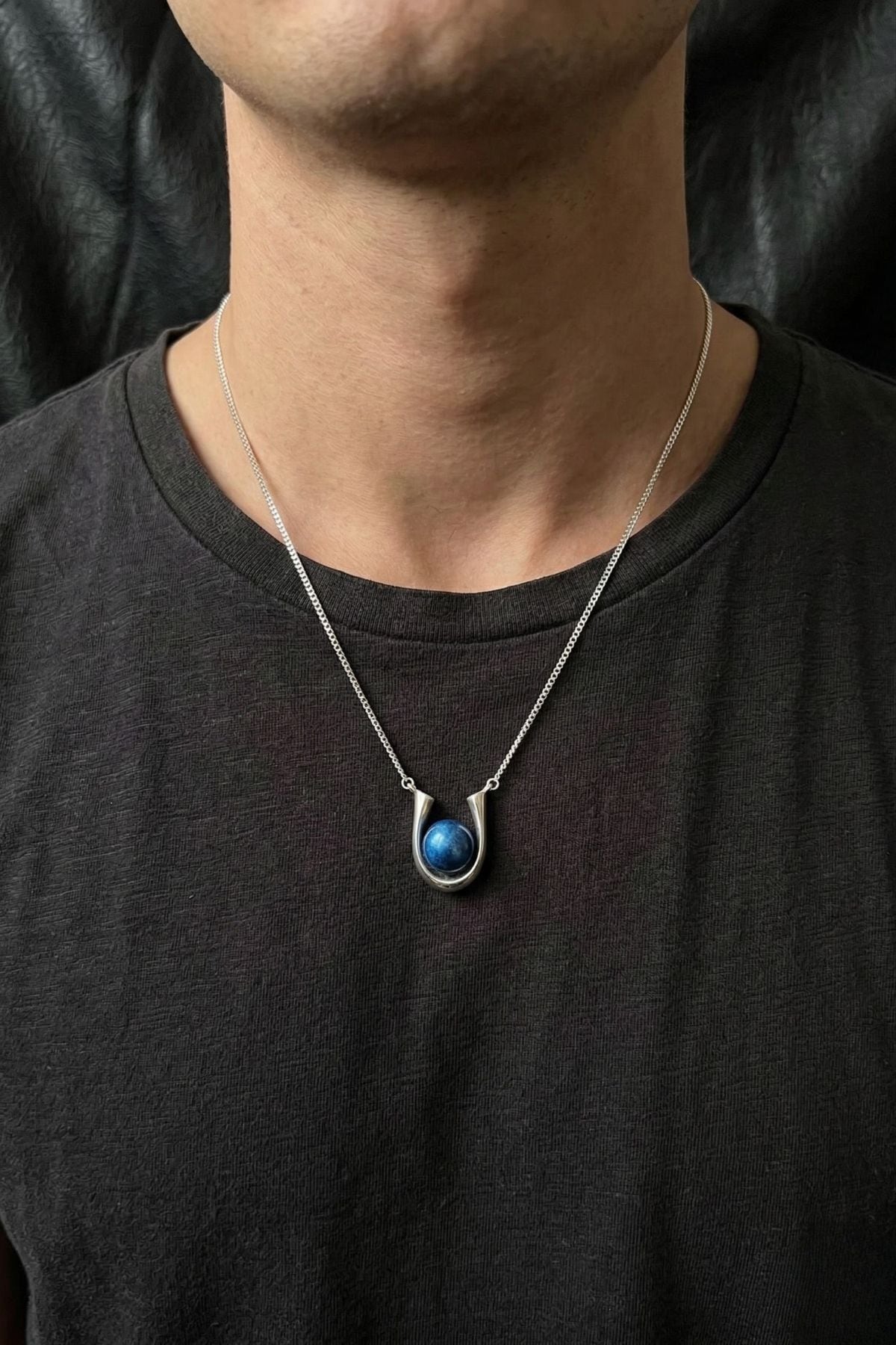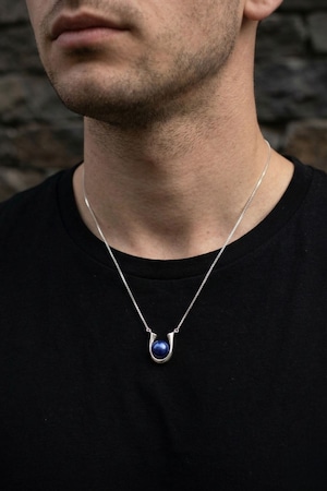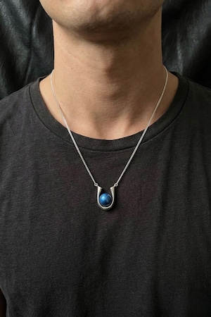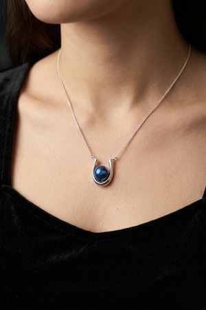 柔らかな曲線が、真珠を包み込むようにデザインされています。装飾を削ぎ落とすことで、藍色の真珠が主役になる設計。男女問わず身につけられるミニマルなデザインです。