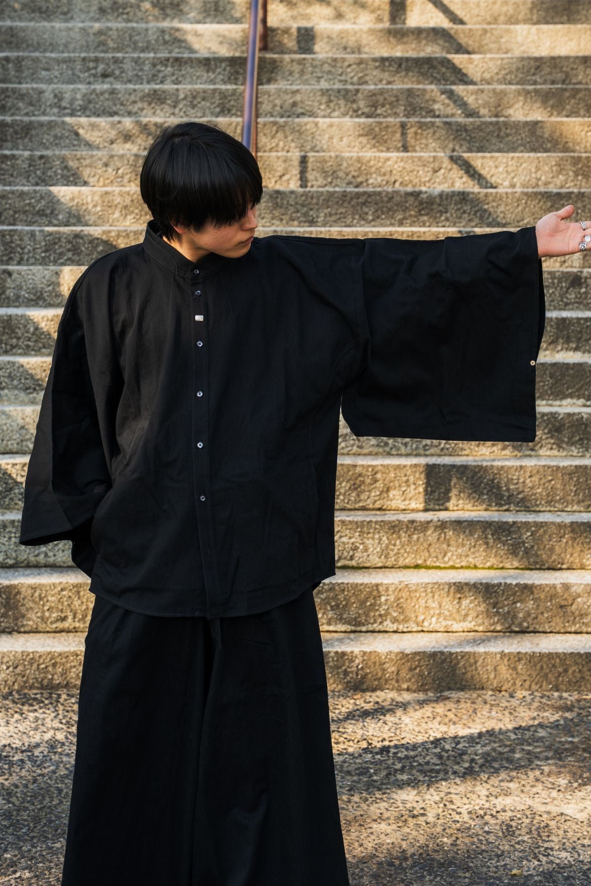 着物の構造をベースに設計。直線的な身頃と広がりのある袖が、身体を締め付けず自然なドレープを生みます。ボタンを閉じればシャツとして。開ければ羽織として。一着で異なる表情を楽しめます。