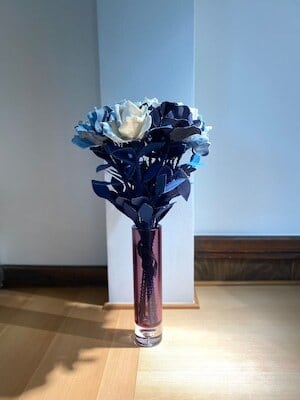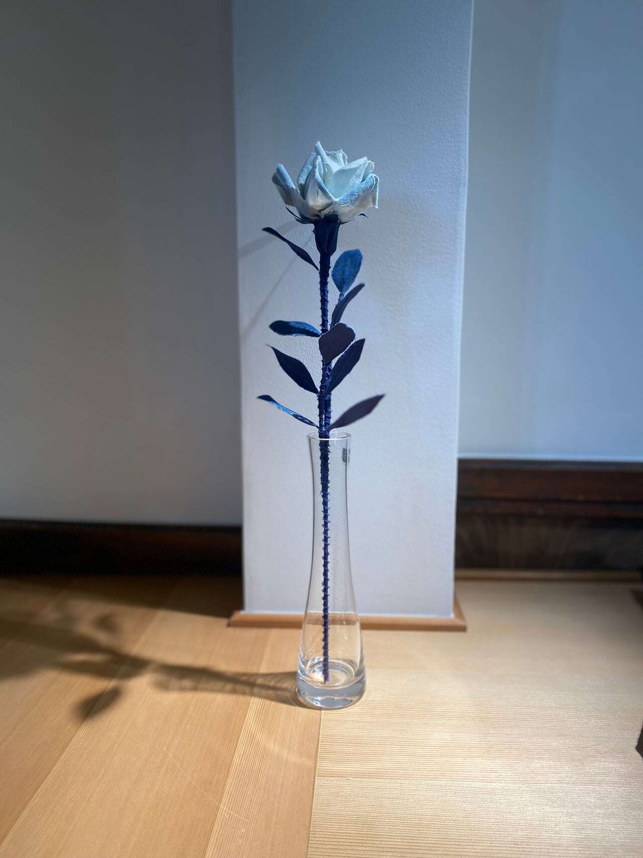 葉の葉脈迄忠実に再現した一枚一枚を手作業で制作した藍バラ となっています。