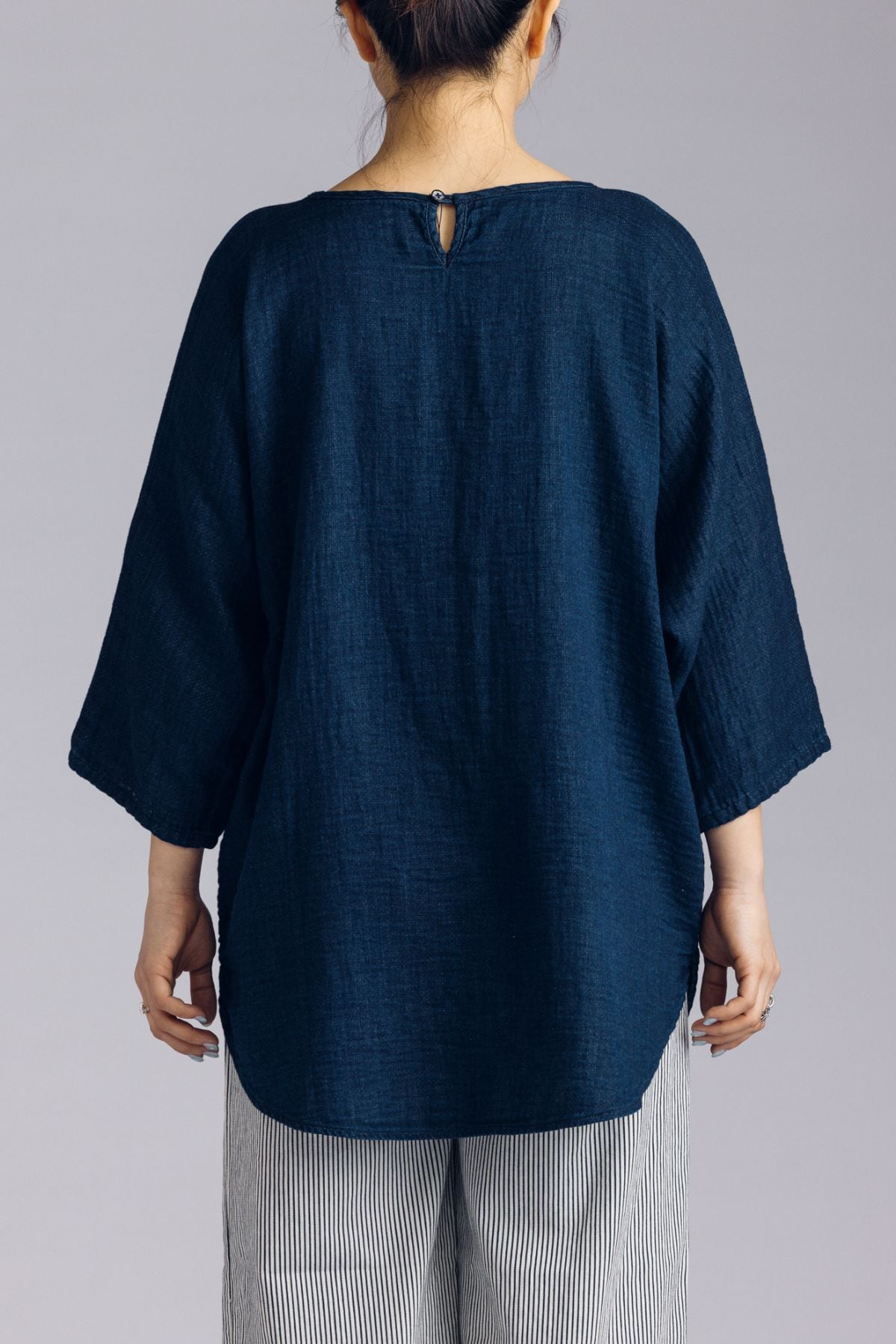 ゆったりとした首元のデザインはデコルテをすっきり見せてくれ、大人な女性を演出してくれます。またお尻まで隠れる着丈によりスタイルもよく見え、ややゆとりのある身幅で着心地にもこだわりがあります。