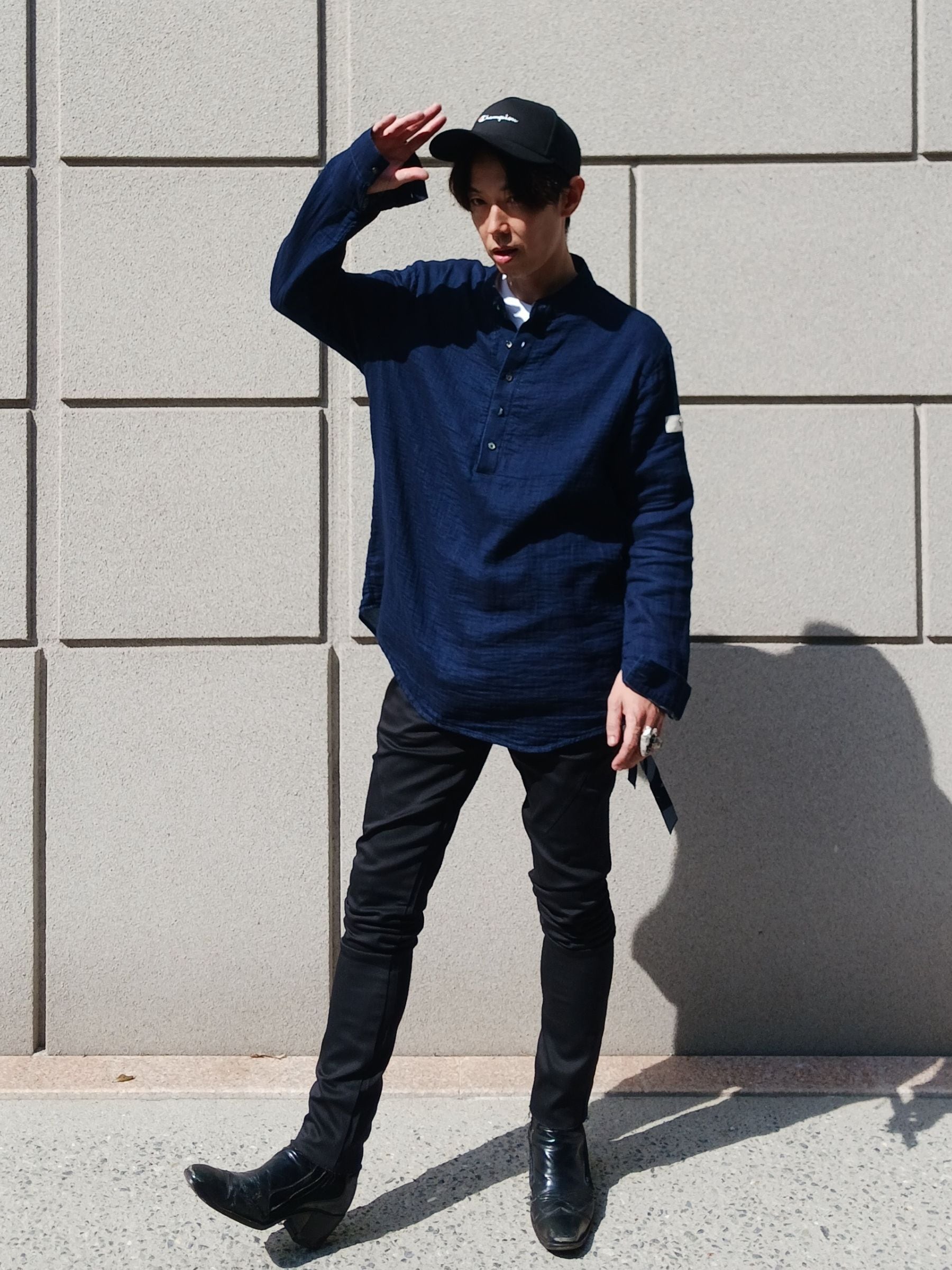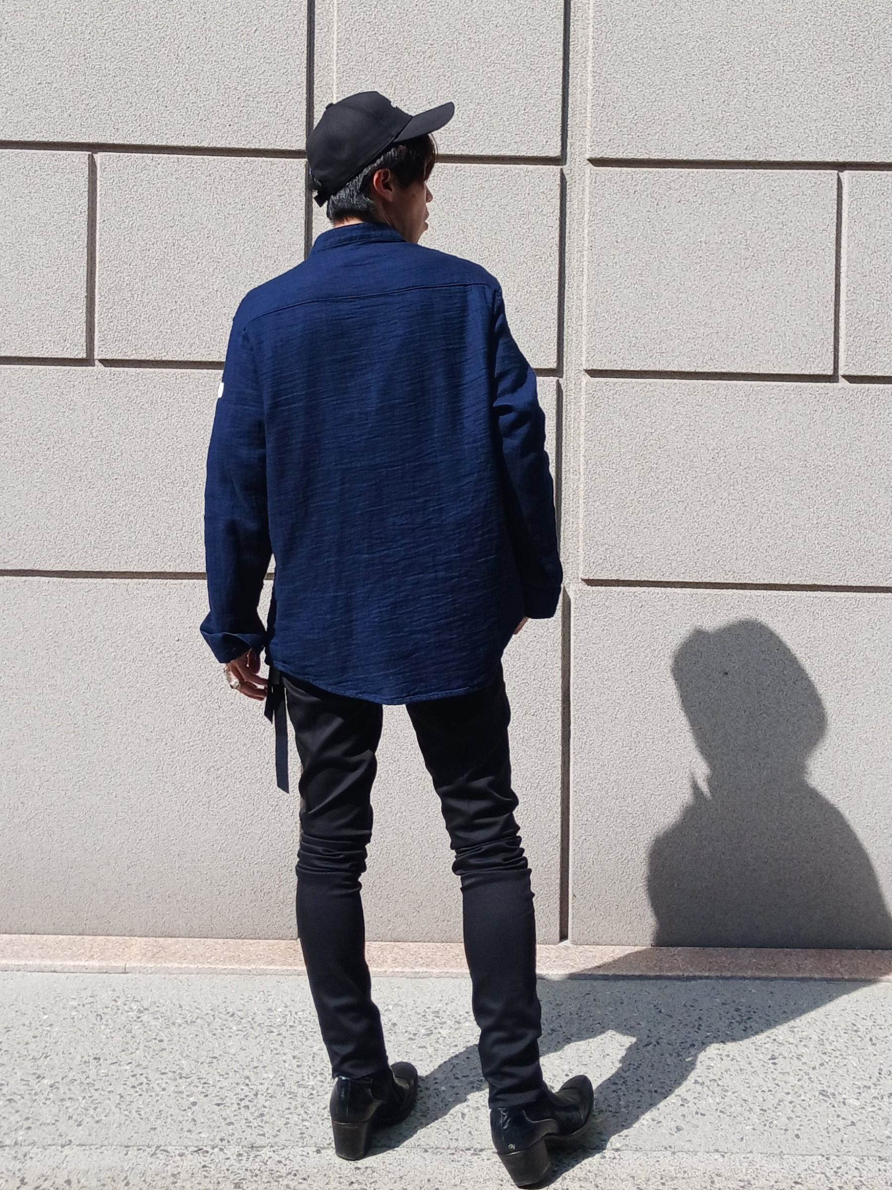 ボタンやリベットなど細部にまでこだわった、開けても閉じてもおしゃれに着こなせるノーカラーシャツが完成しました。