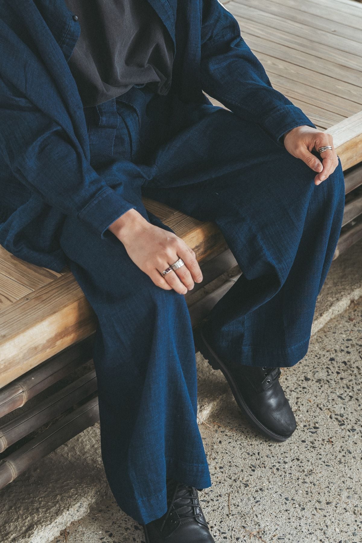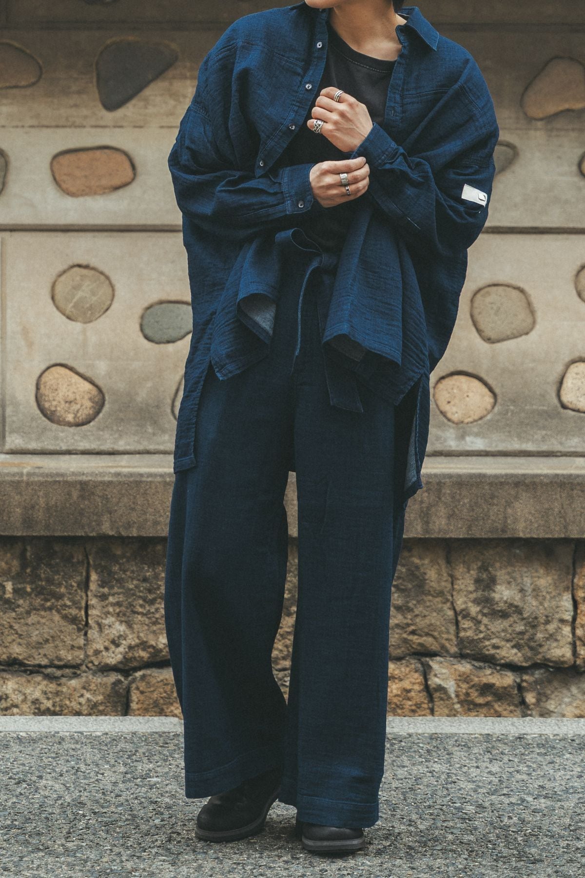 ✔ 同素材シャツとのセットアップで「抜け感あるモードスタイル」に
