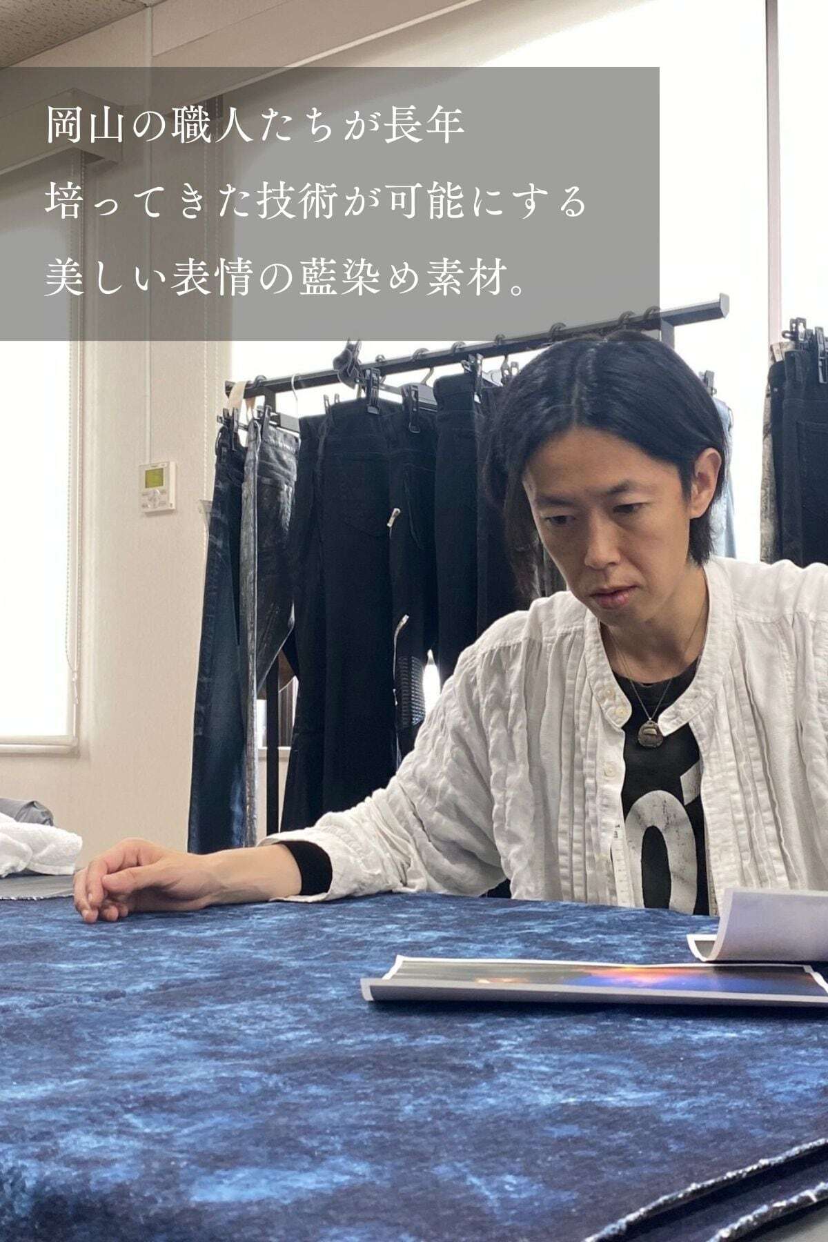 素材には井原市 山足織物製の12ozデニムを使用。程よいコシと適度なストレッチ性のあるデニム素材となっており、井原デニムの真骨頂と言われる 従来のデニムイメージを覆す様な美しい素材表情が特徴です。